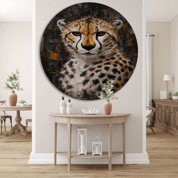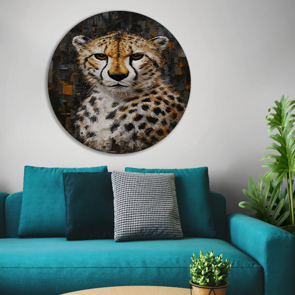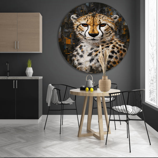 Abstracte Cheetah in Stedelijk Landschap aluminium muurcirkel