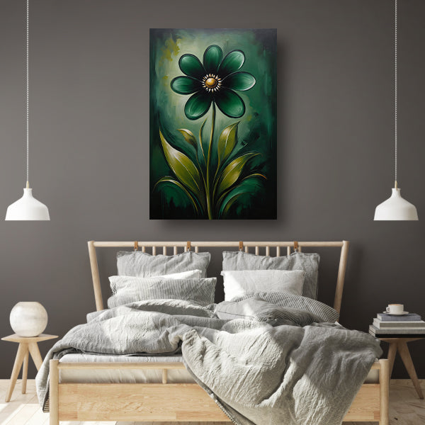 Abstracte Donkergroene Bloem met Gouden Kern canvas met baklijst