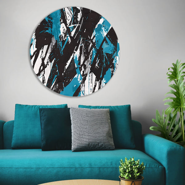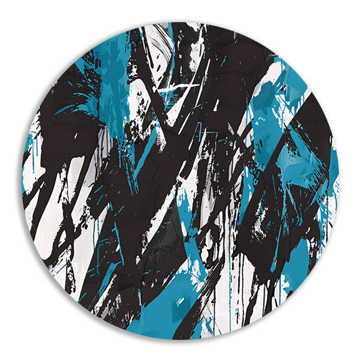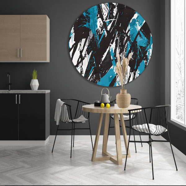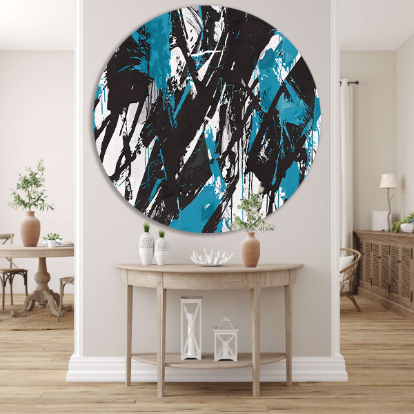Abstracte dynamiek in zwart, wit en blauw aluminium muurcirkel