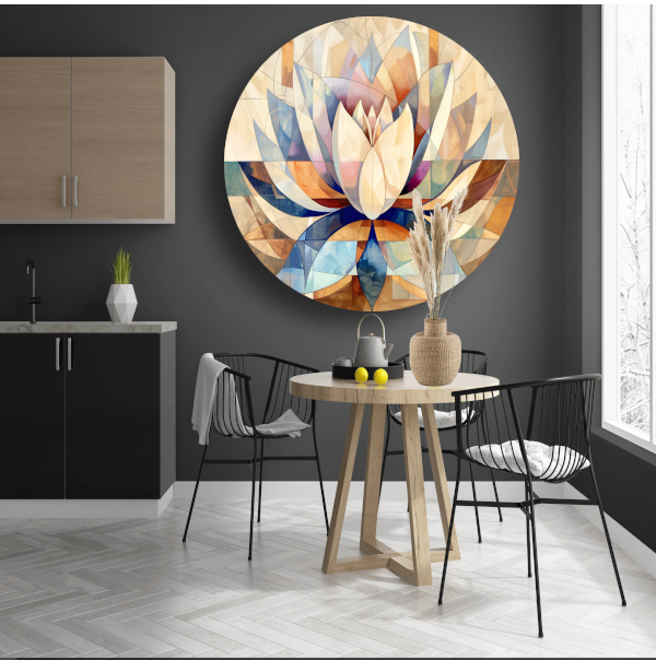 Of je nu een minimalistisch interieur hebt of juist houdt van kleurrijke accenten, deze Abstracte Geometrische Lotus in Kleur muurcirkel past perfect in elke stijl. Voeg een vleugje kunst en elegantie toe aan jouw huis met dit prachtige kunstwerk!