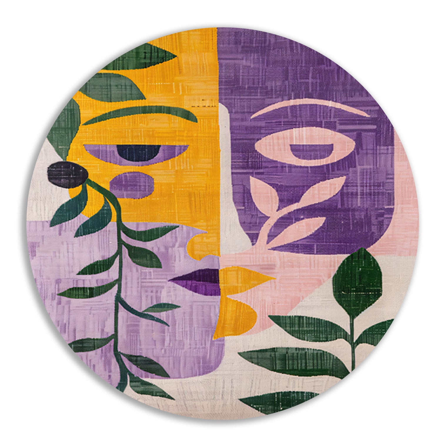 Abstracte gezichten met bladeren in kleur aluminium muurcirkel
