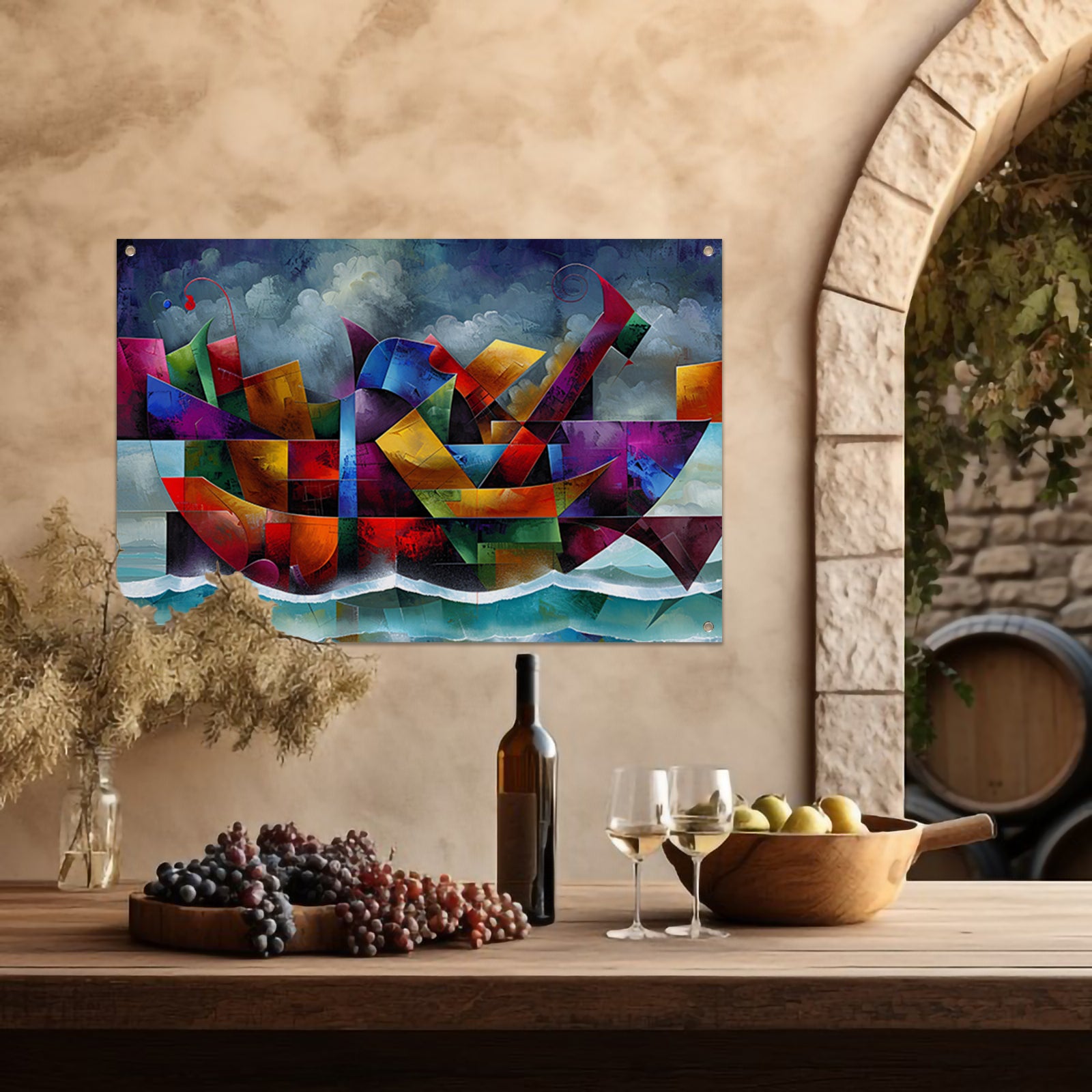 Abstracte Kleurenstorm met Golven en Boot tuinposter