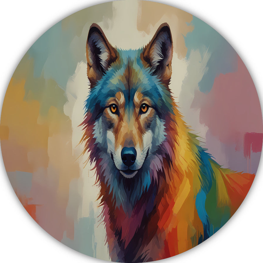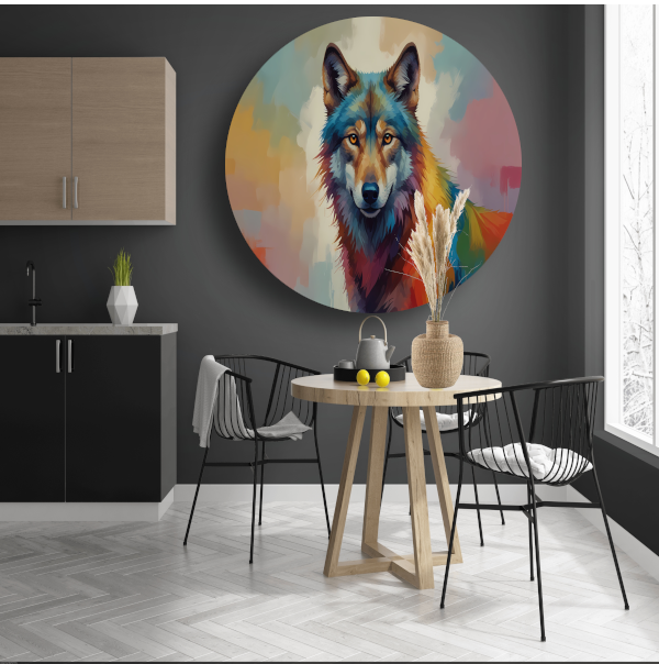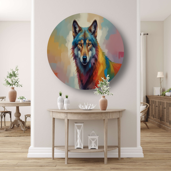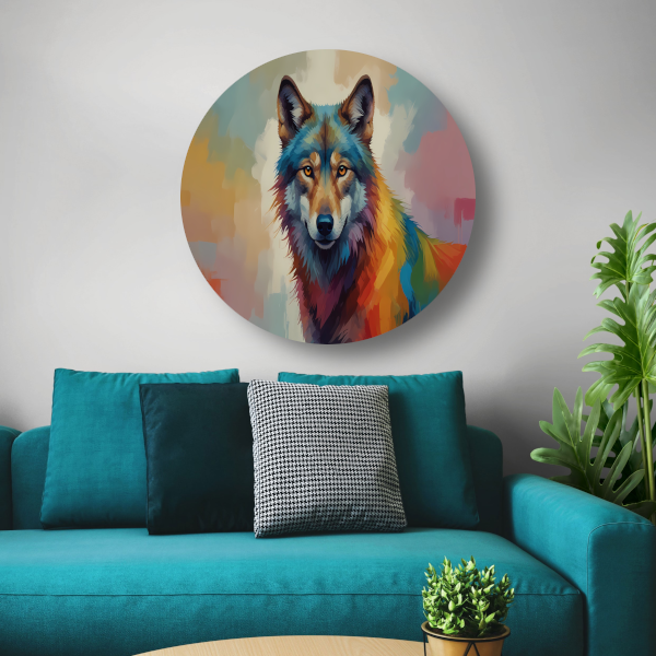 Abstracte kleurexplosie wolf portret aluminium muurcirkel
