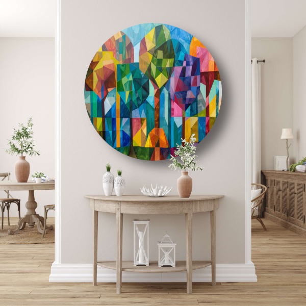 Breng de schoonheid van de natuur en de moderniteit van de stad samen in jouw huis met deze prachtige muurcirkel van abstracte kleurrijke bomen in een geometrische stad.
