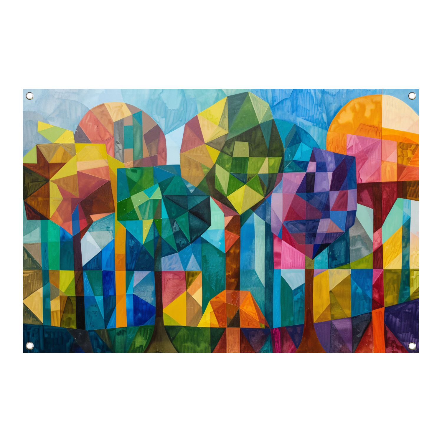 Abstracte kleurrijke bomen in geometrische stad tuinposter