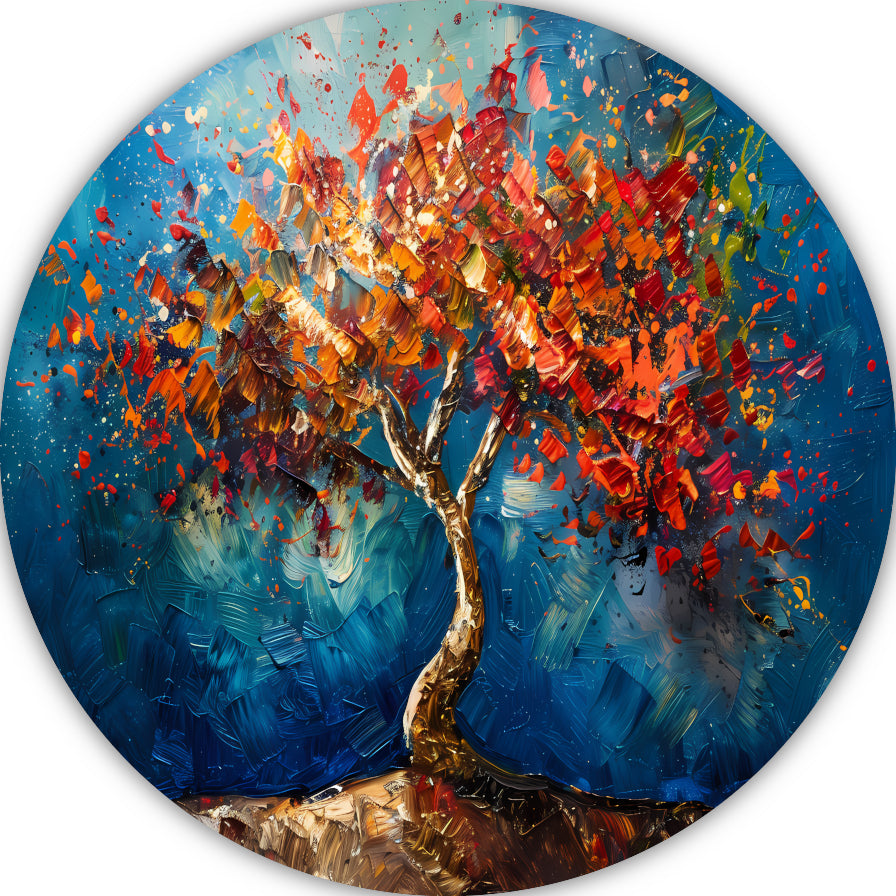 Haal dit unieke stukje kunst in huis en geef je muur een upgrade met deze prachtige abstracte kleurrijke boom in olieverf weergave op aluminium muurcirkel.