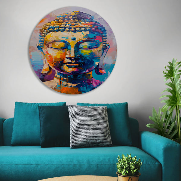 Abstracte Kleurrijke Interpretatie van een Boeddha Hoofd aluminium muurcirkel