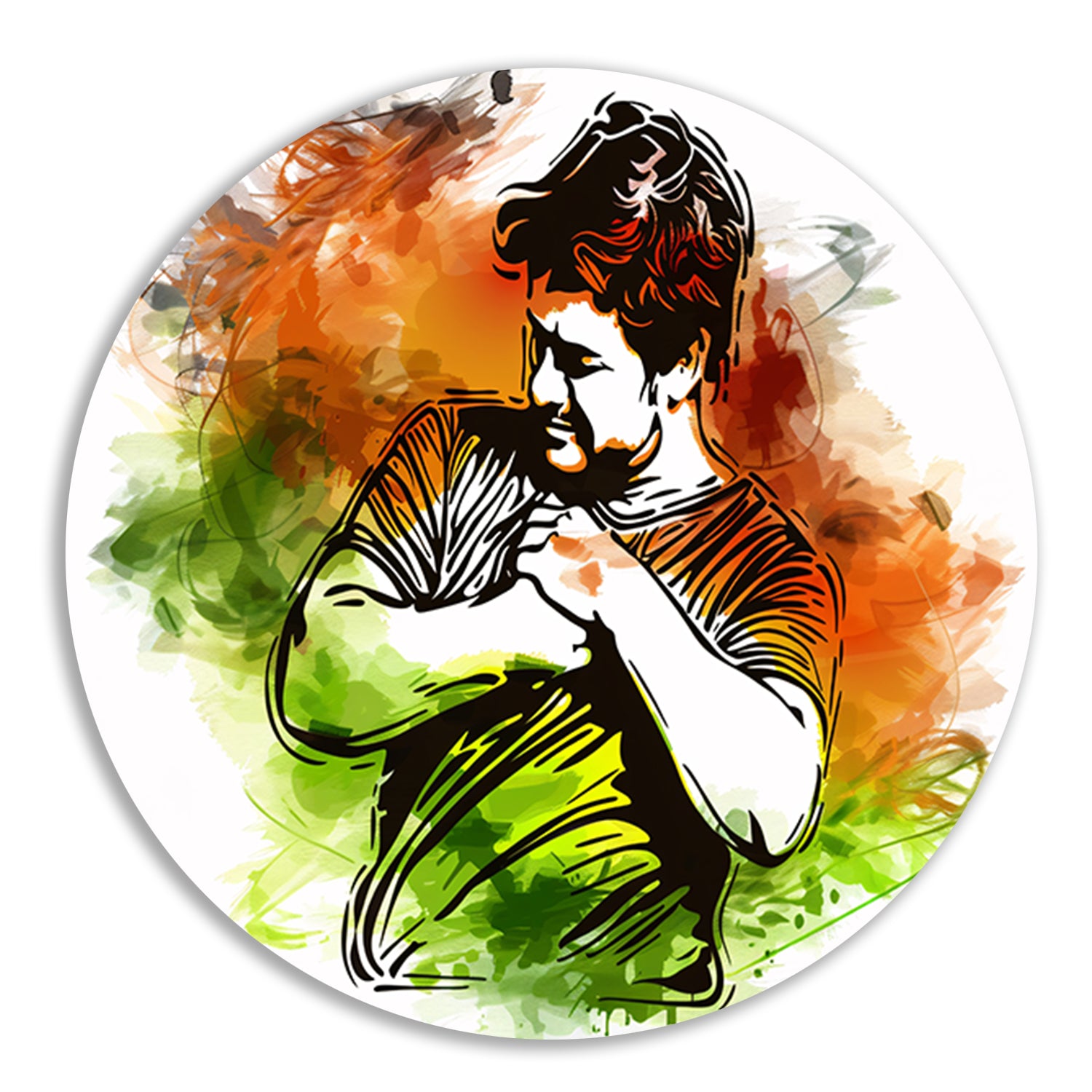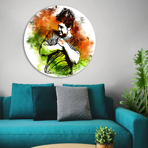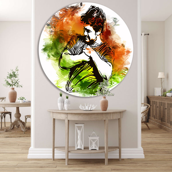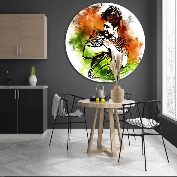 De abstracte lijntekening van de man geeft een artistieke en moderne uitstraling aan je interieur. De kleuren spatten van de muur en zorgen voor een levendige sfeer in de ruimte. Of je nu een strak en minimalistisch interieur hebt of juist houdt van kleur en speelsheid, deze muurcirkel past perfect in elke stijl.