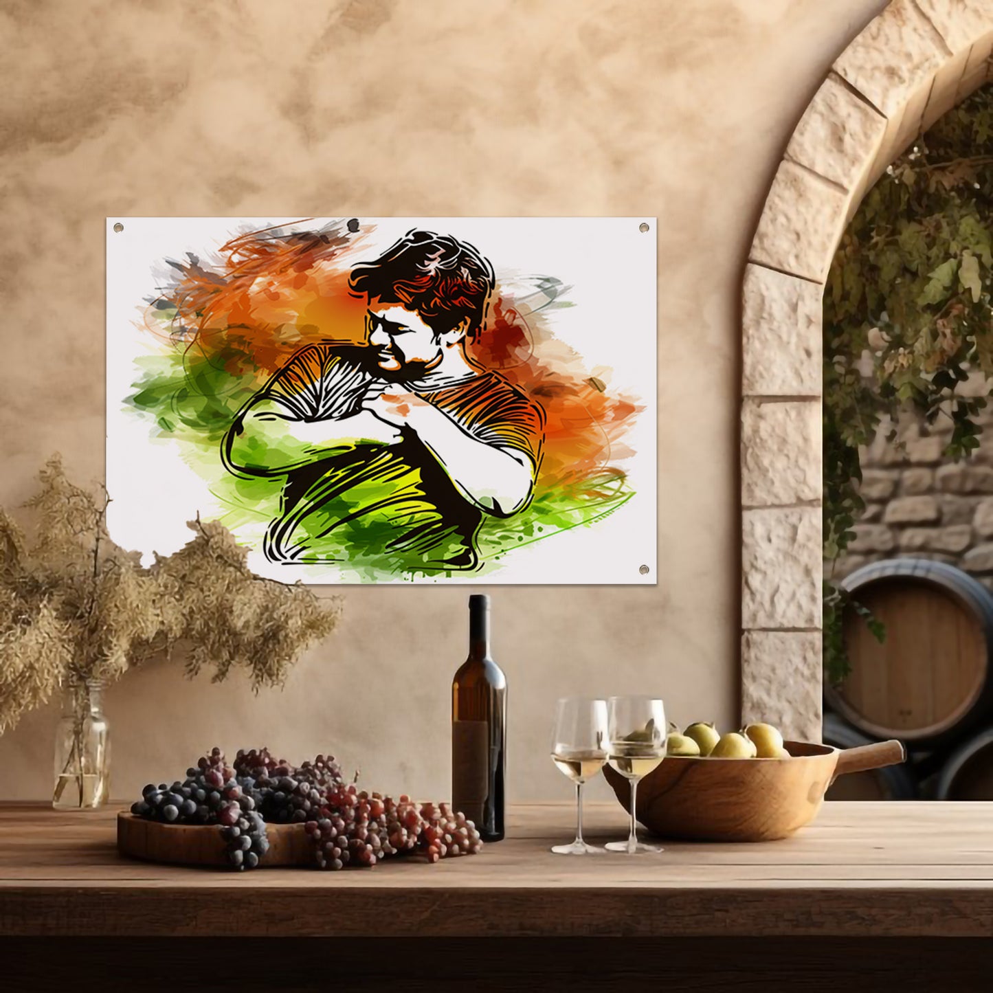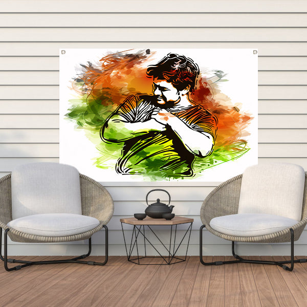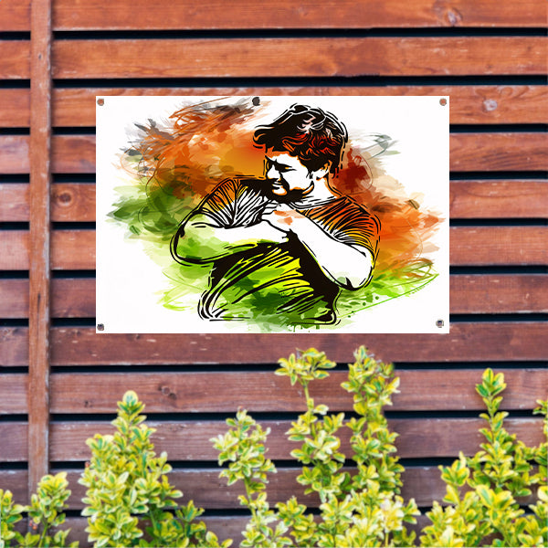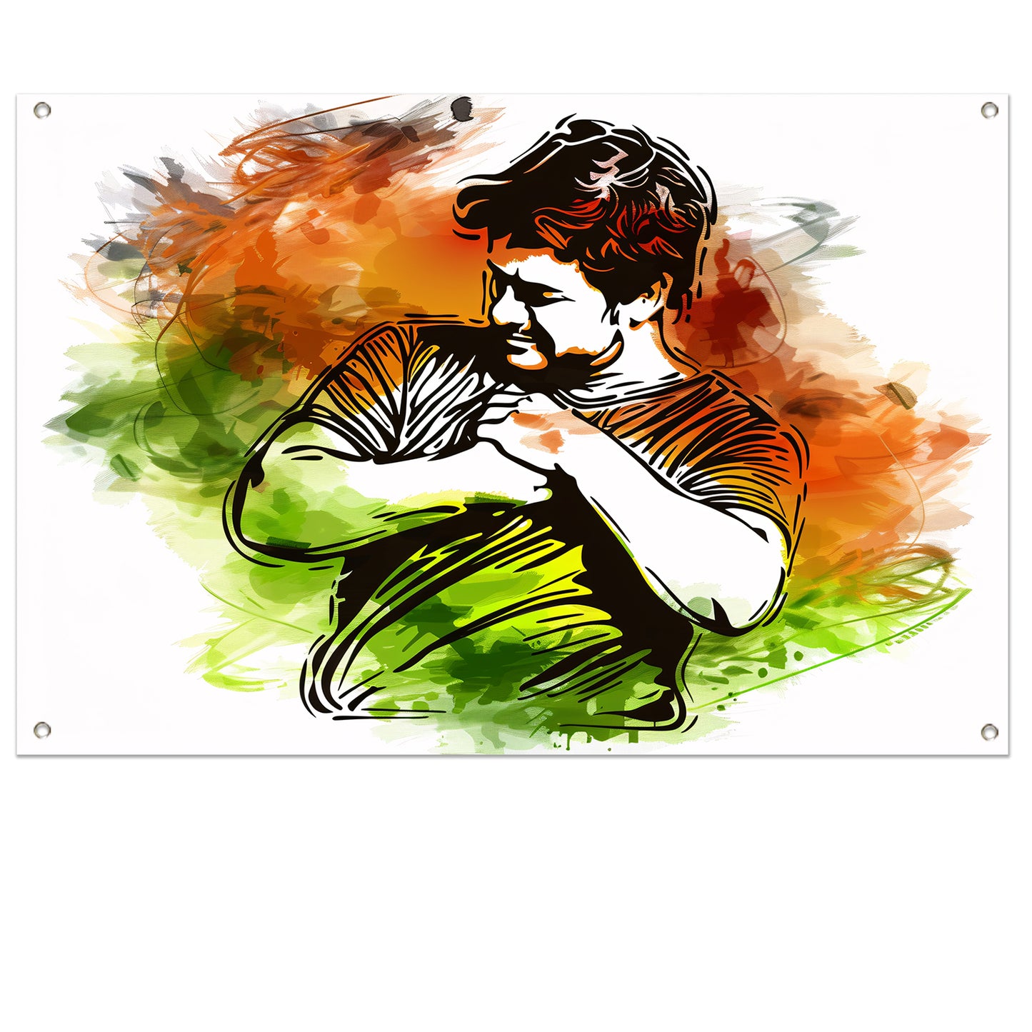 Abstracte kleurrijke lijntekening van een man tuinposter