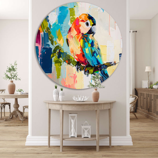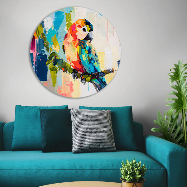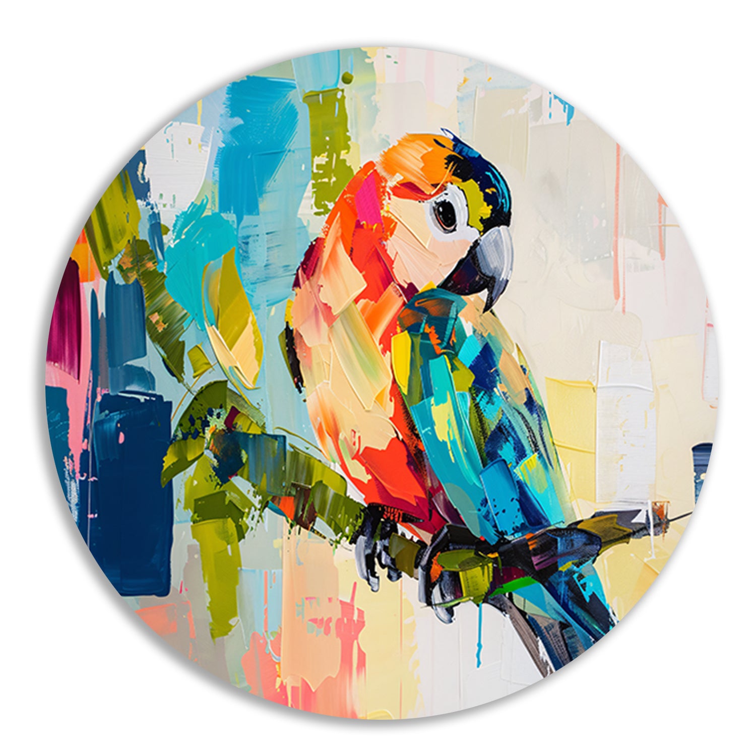 Abstracte kleurrijke papegaai op tak aluminium muurcirkel