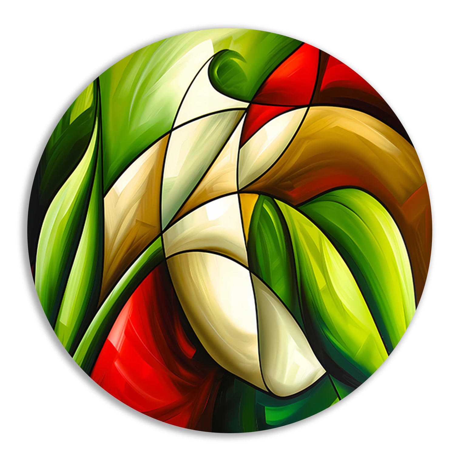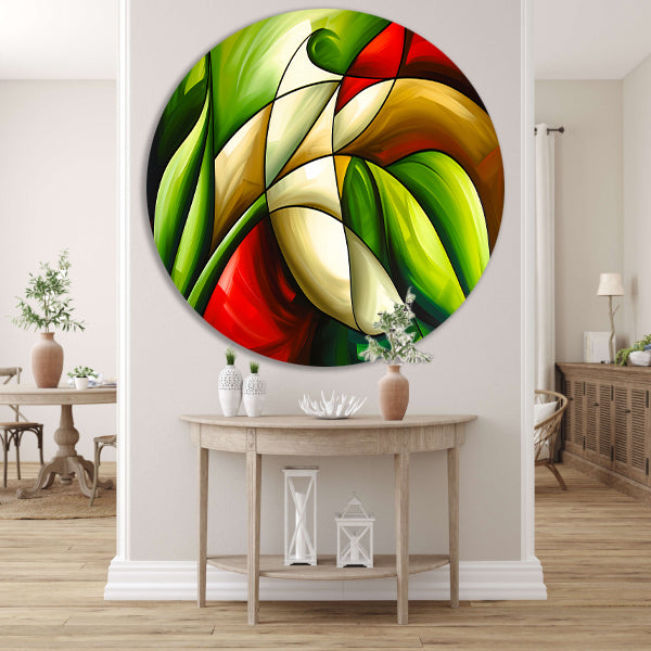 Voeg dit prachtige abstracte kleurrijke roos en bladeren schilderij forex muurcirkel toe aan je collectie kunstwerken en geef je ruimte een vleugje elegantie en levendigheid.