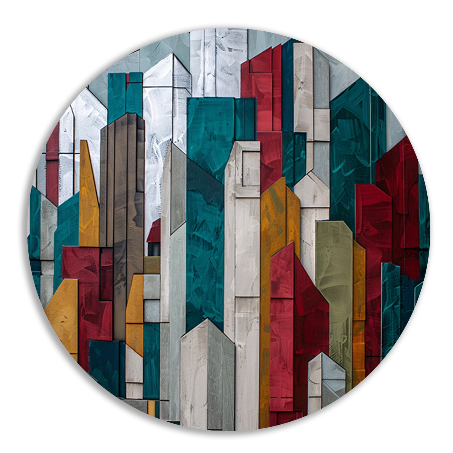 Abstracte kleurrijke skyline met geometrische vormen aluminium muurcirkel
