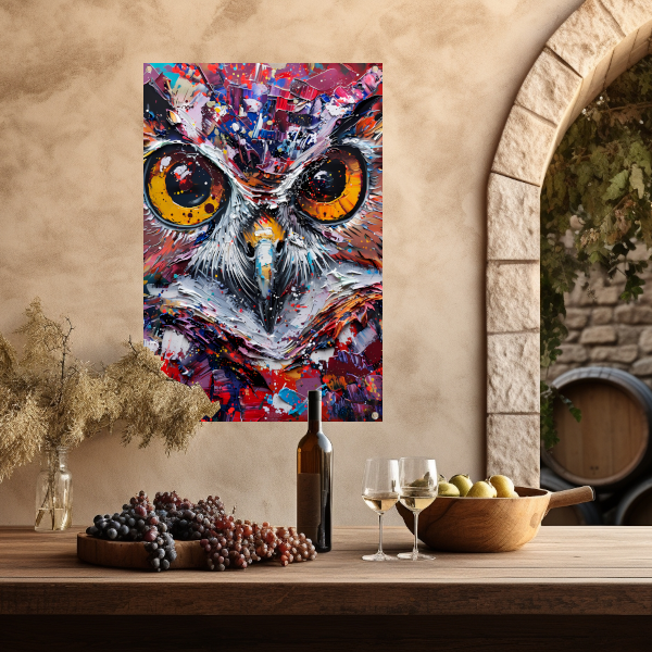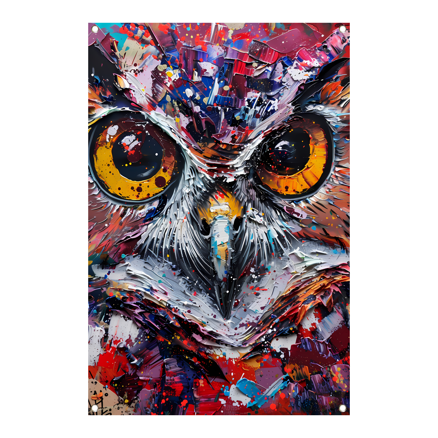 Abstracte, kleurrijke uil met dynamische verfexplosies tuinposter