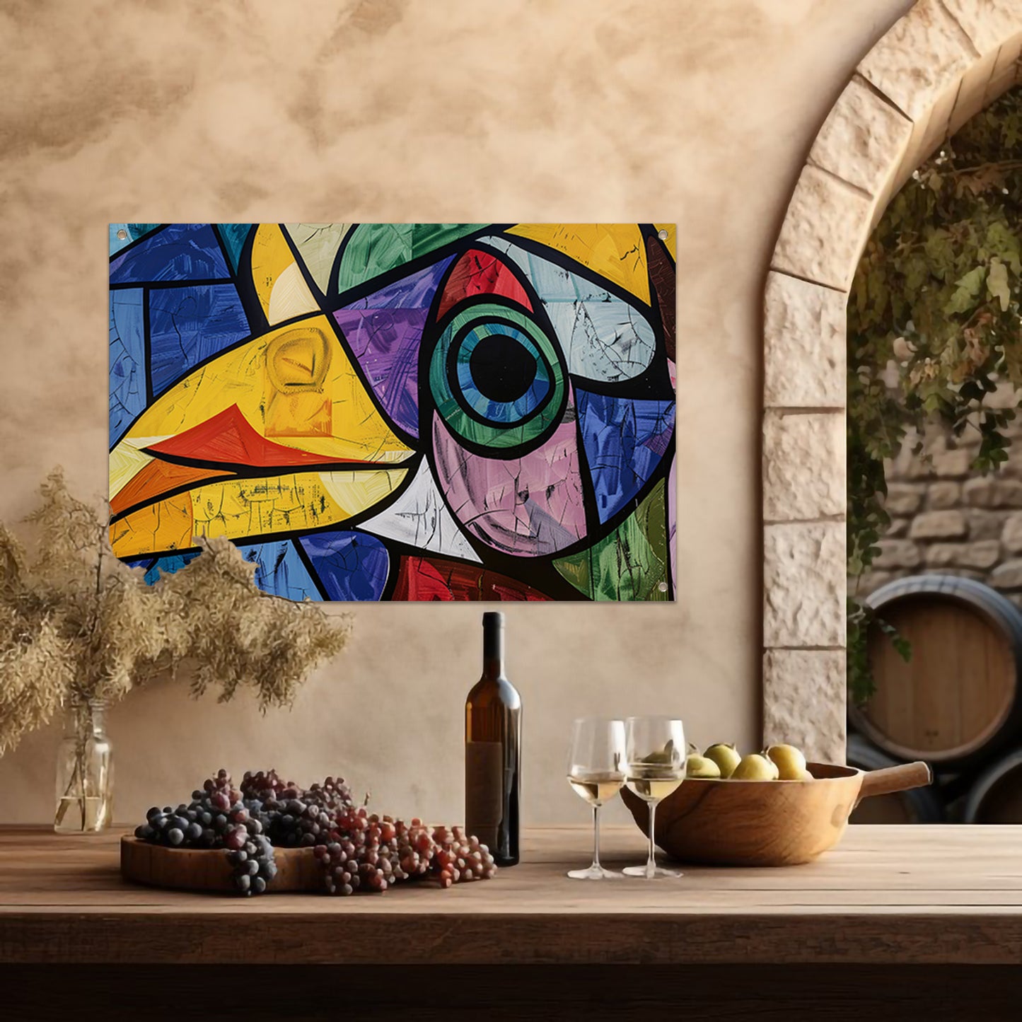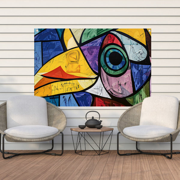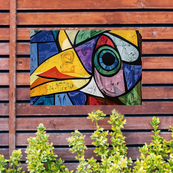 Abstracte kleurrijke vogel met geometrische vormen tuinposter