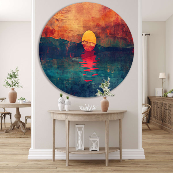 Met meerdere maten om uit te kiezen, kun je de perfecte afmeting selecteren die past bij jouw ruimte en interieur. Creëer een rustgevende en inspirerende sfeer met deze abstracte kleurrijke zonsondergang over water aluminium muurcirkel. Een prachtige aanvulling op elk modern of eigentijds interieur.