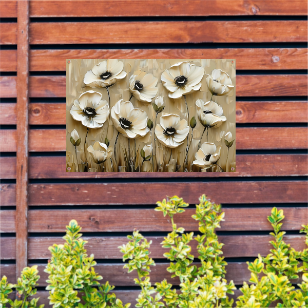 Onze tuinposters zijn UV- en waterbestendig, waardoor ze bestand zijn tegen zon en regen en hun kleuren langdurig mooi blijven. Alle tuinposters van De Muurdecoratie zijn voorzien van ringen in de hoeken, zodat je ze eenvoudig kunt ophangen. Let op: onze tuinposters worden niet met ophangsysteem geleverd.
