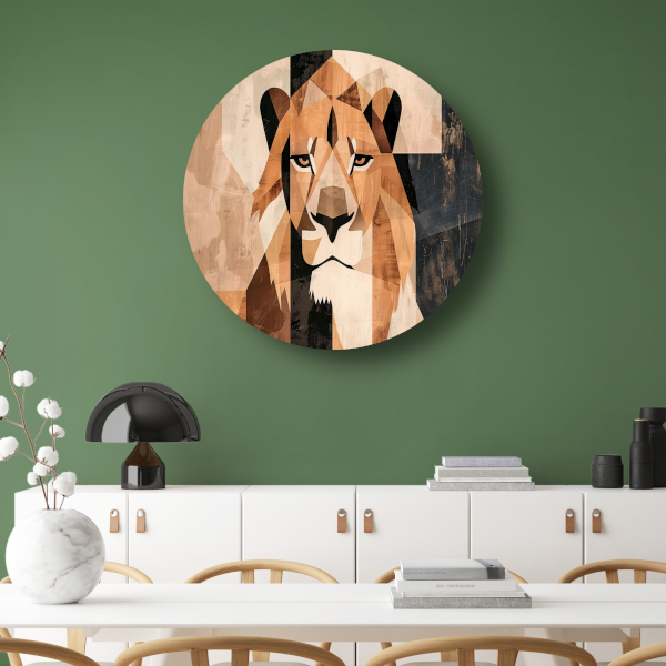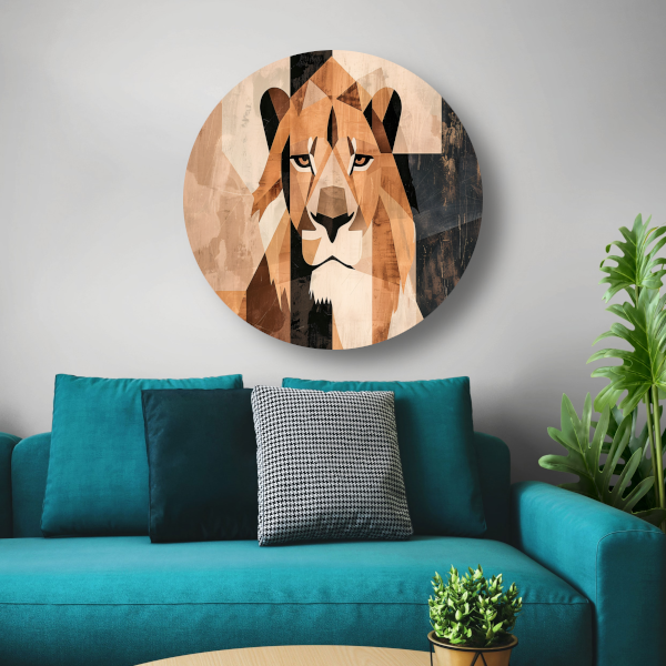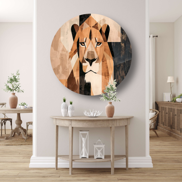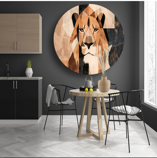 Deze muurcirkel is verkrijgbaar in diverse maten, zodat je altijd de juiste afmeting kunt kiezen voor jouw ruimte. Of je nu op zoek bent naar een opvallend kunstwerk voor in de woonkamer of een subtiele toevoeging aan de slaapkamer, deze abstracte monochrome leeuw past in elk interieur. Met zijn geometrische stijl en moderne uitstraling is het een echte blikvanger in huis.