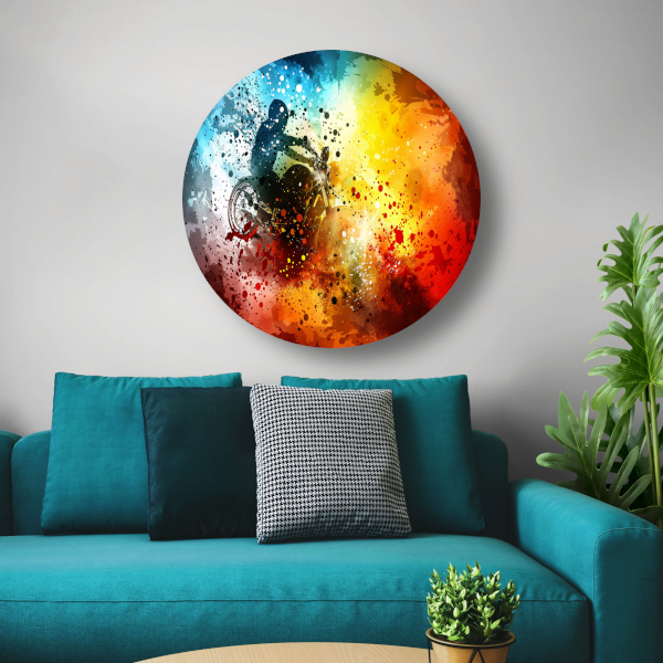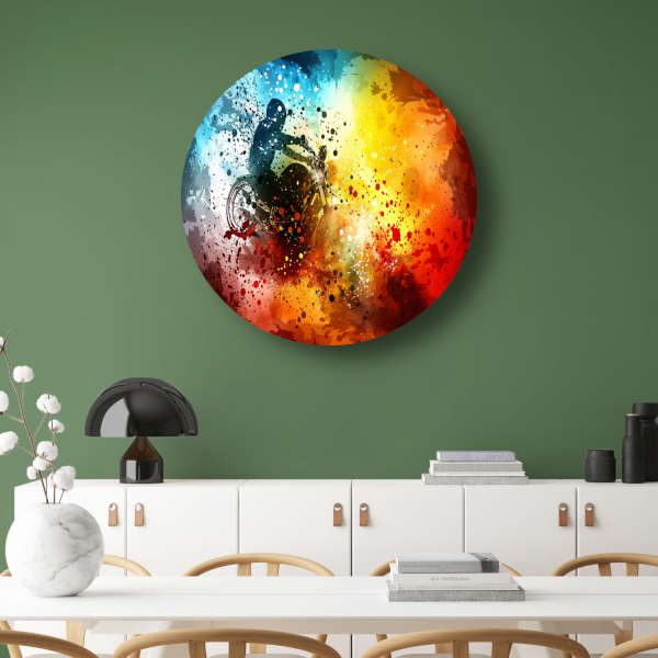 Abstracte Motorrijder in Eplosie van Kleur aluminium muurcirkel