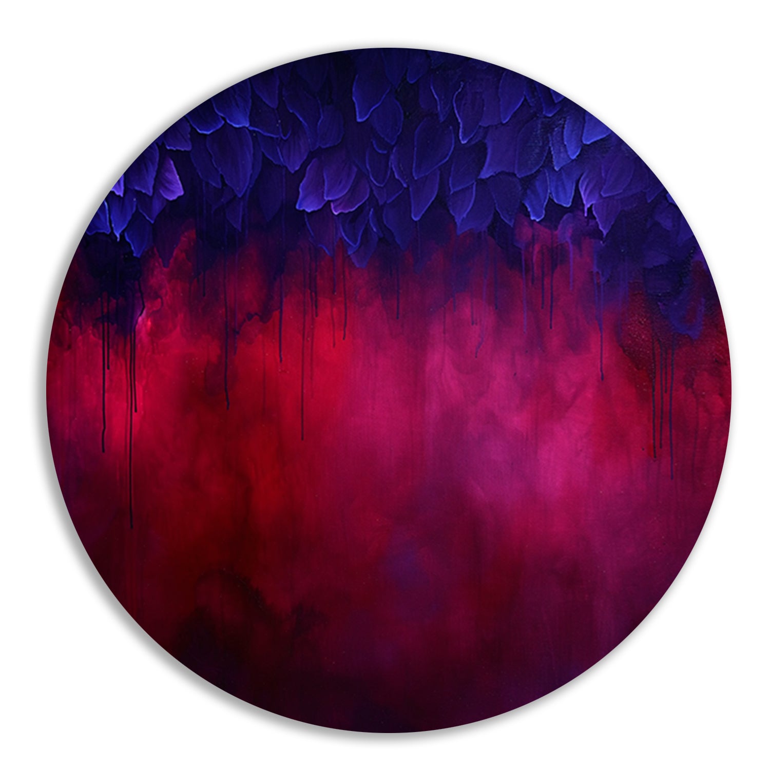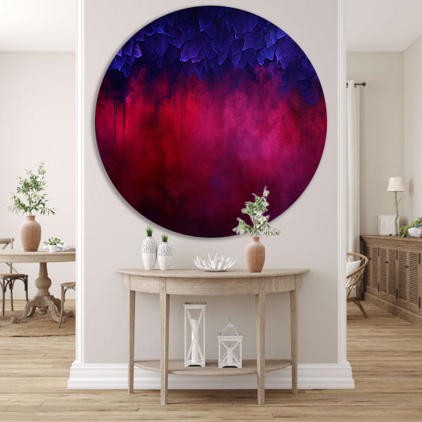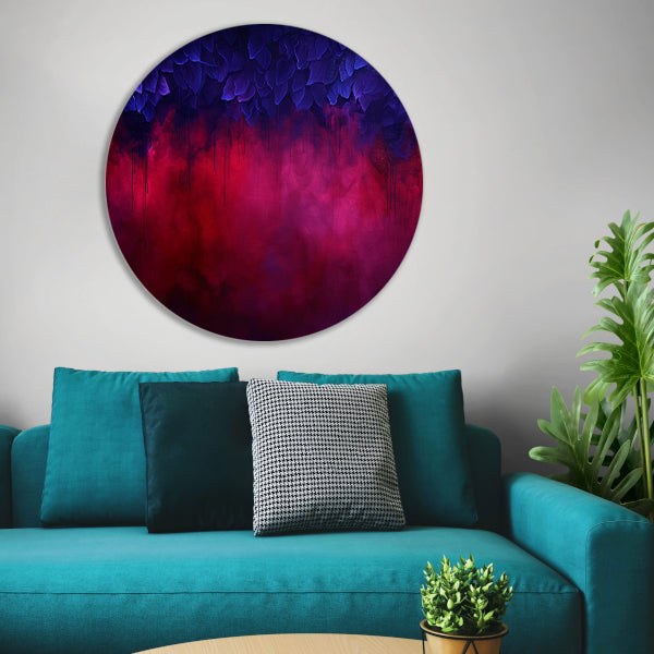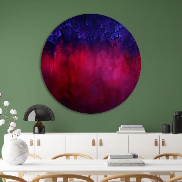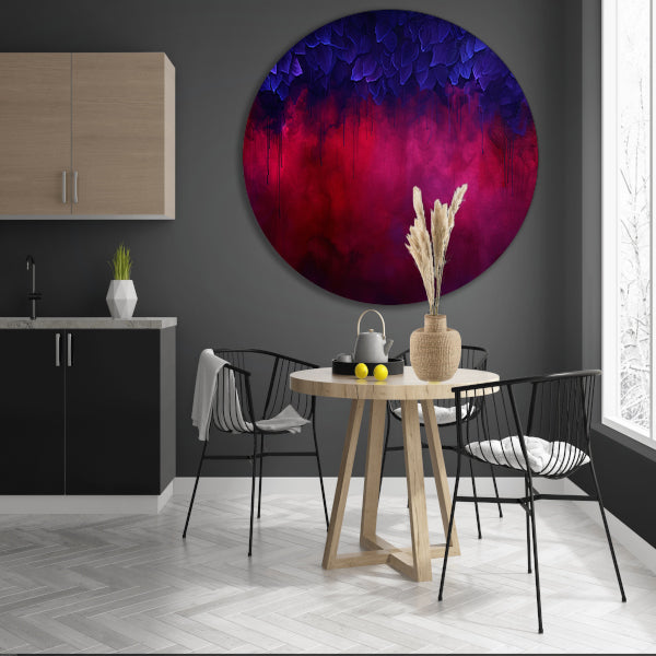 Breng een vleugje kunst en kleur in huis met deze abstracte paarse en rode rook met bladeren aluminium muurcirkel en geef jouw interieur een stijlvolle upgrade!