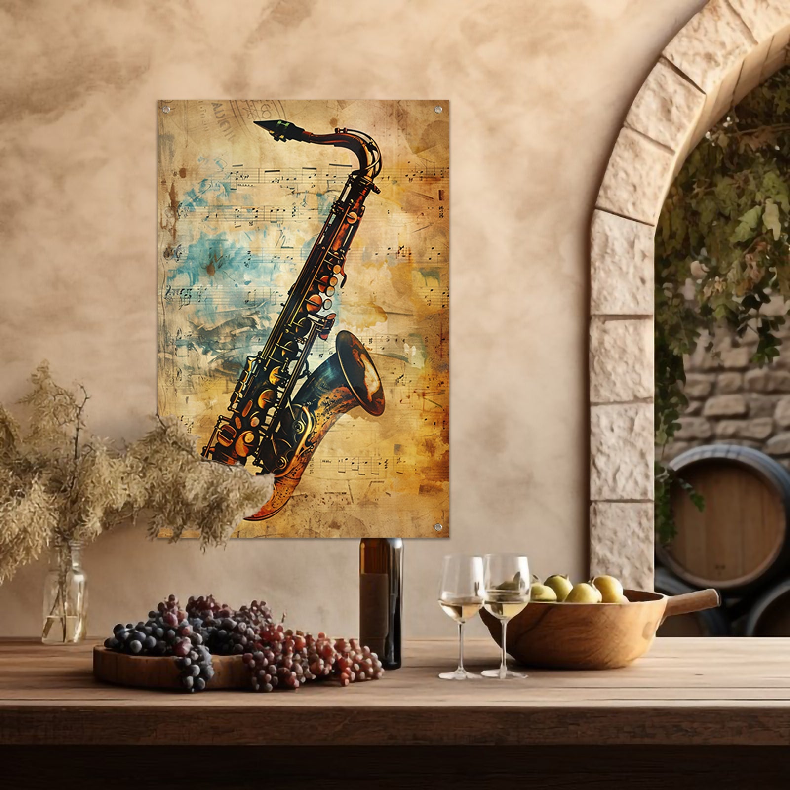 Abstracte Saxofoon op Muziekpapier tuinposter