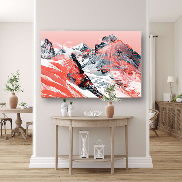 Abstracte schilderij van berglandschap in rood canvas met baklijst