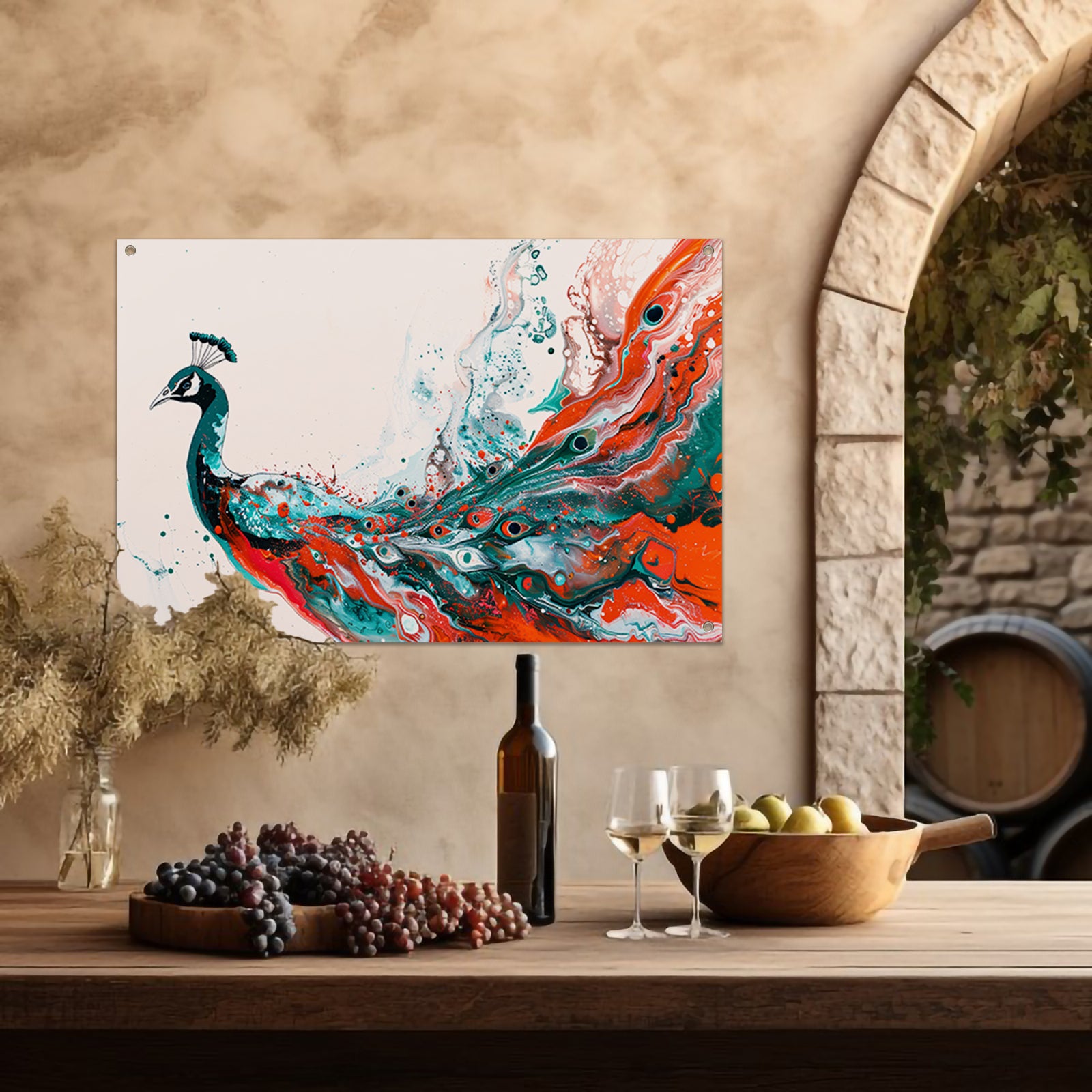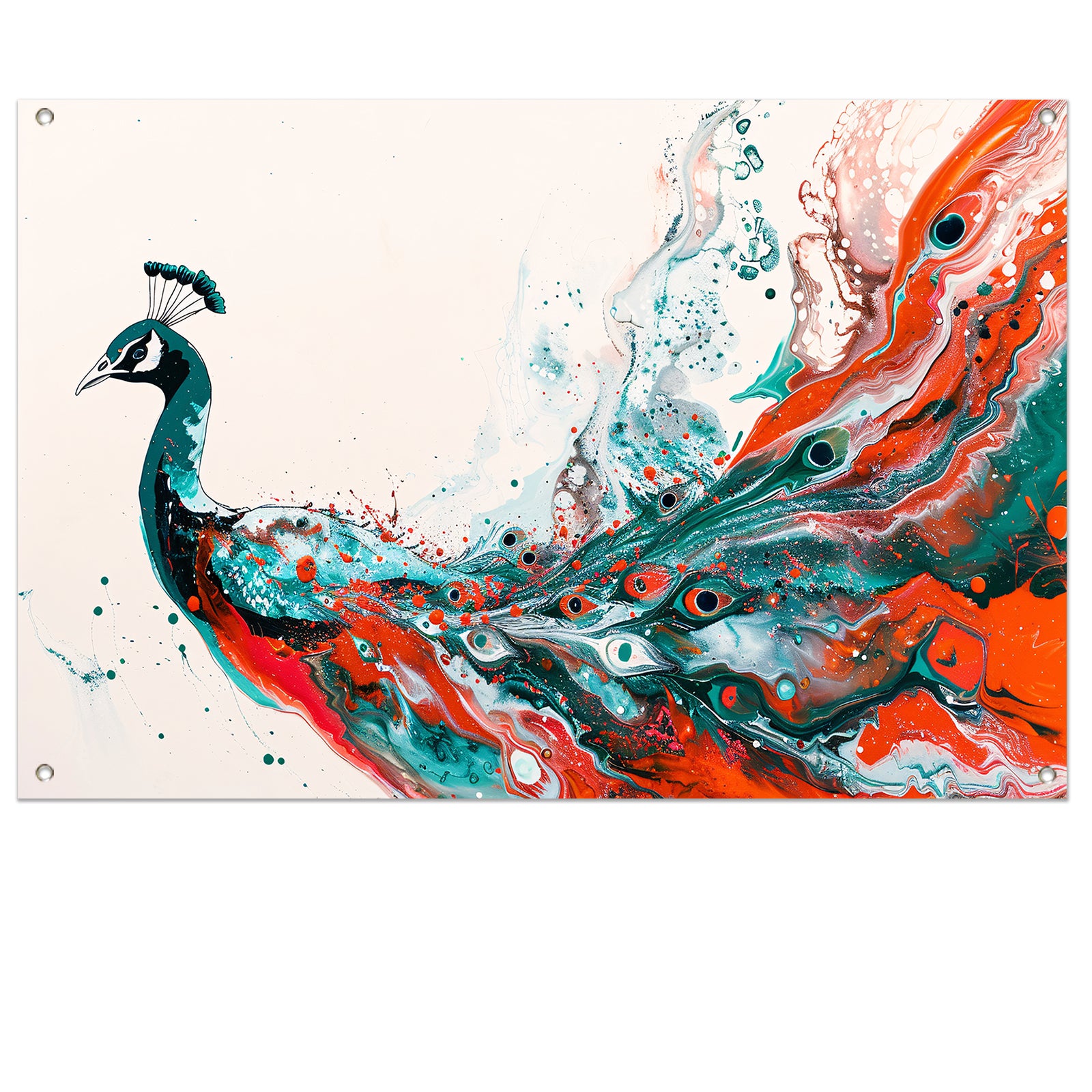 Abstracte schildering van kleurrijke pauw tuinposter