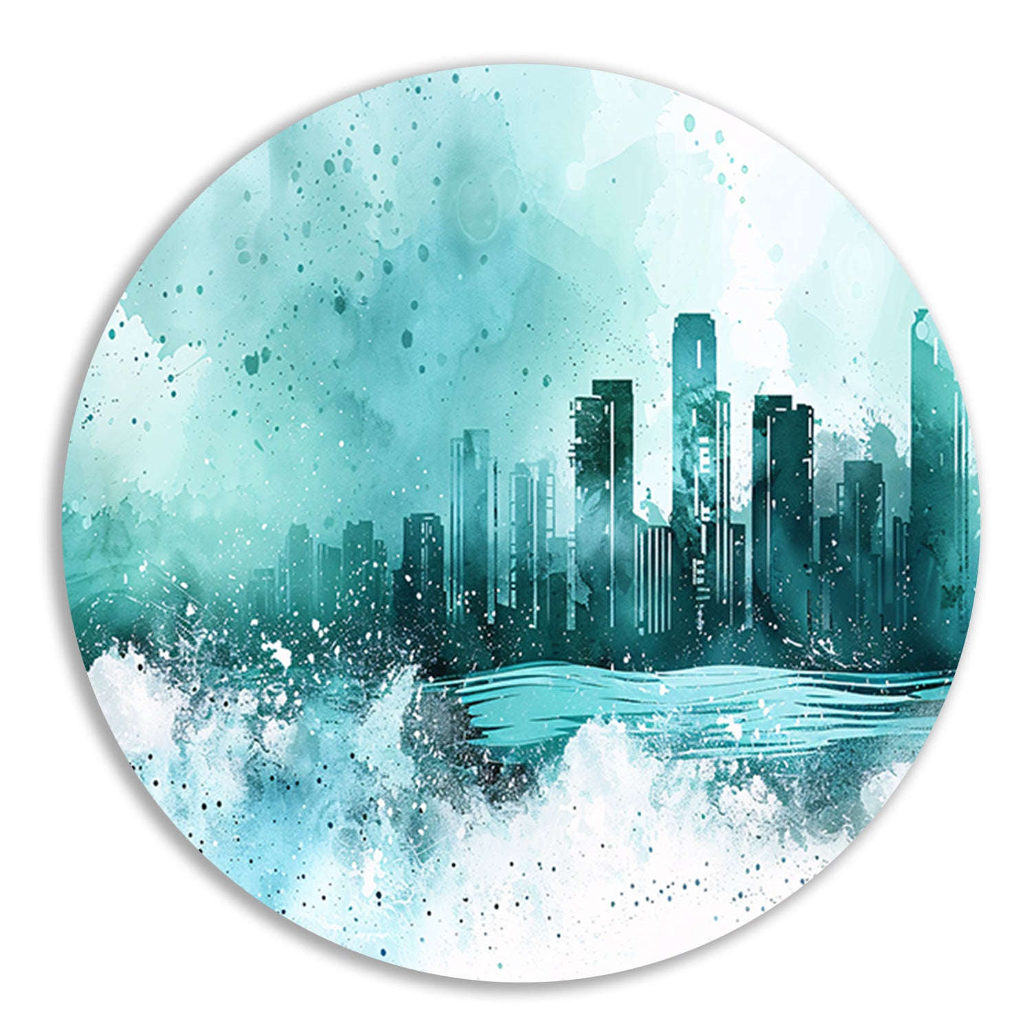 Abstracte skyline in blauwe tinten schilderij aluminium muurcirkel
