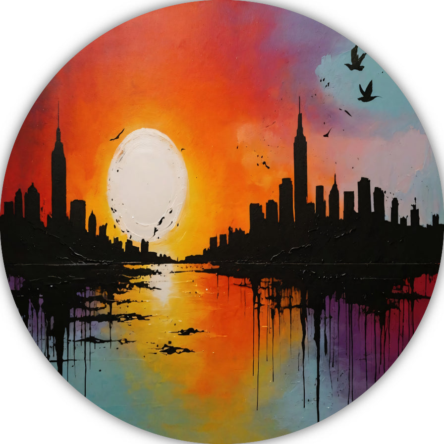 Abstracte stadssilhouet bij zonsondergang forex muurcirkel