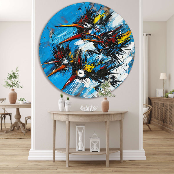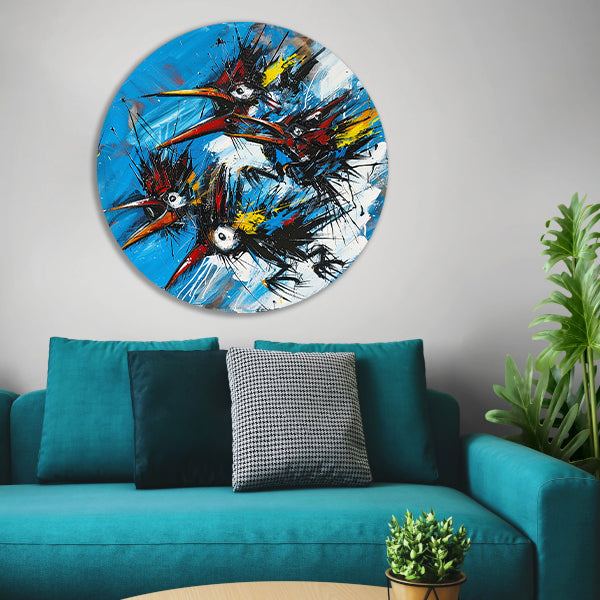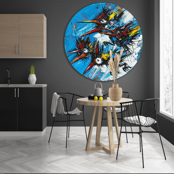 Abstracte Vogels in Kleurrijke Chaos aluminium muurcirkel