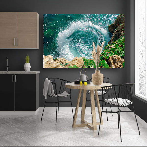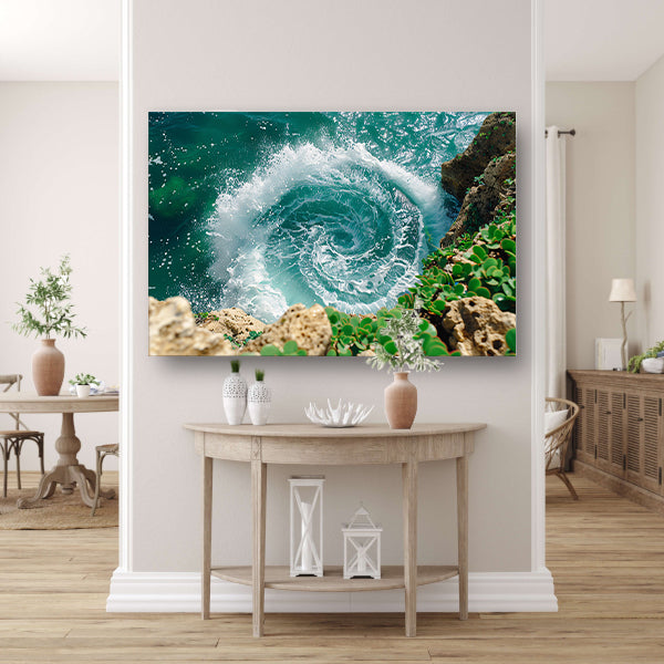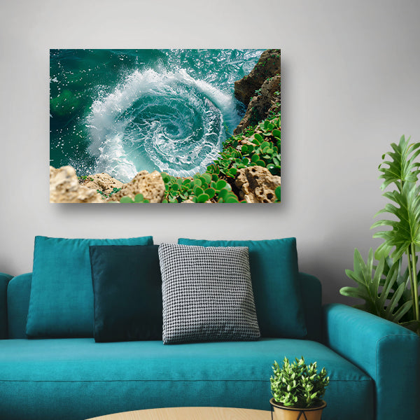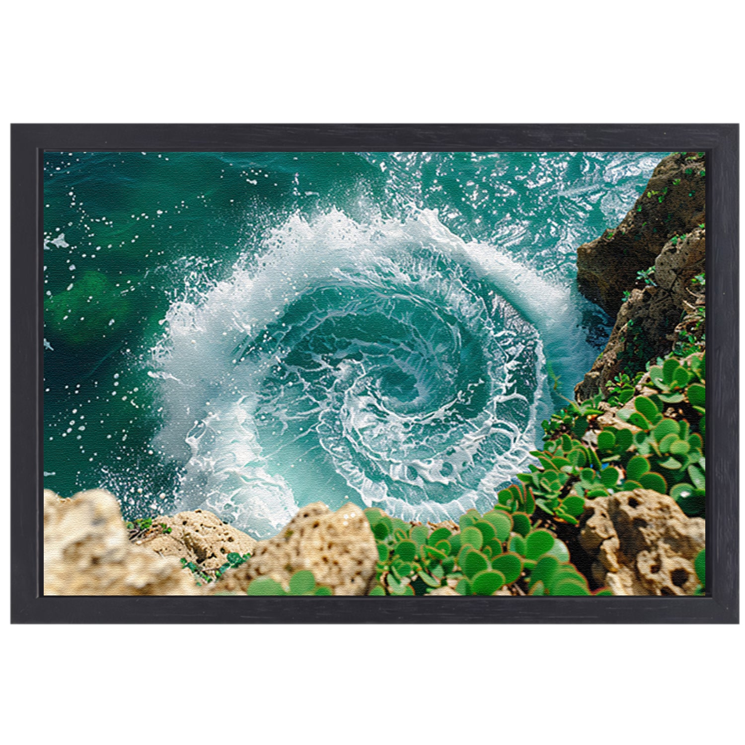 Abstracte waterwerveling bij rotsachtige kust canvas met baklijst