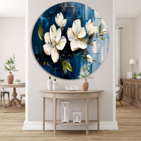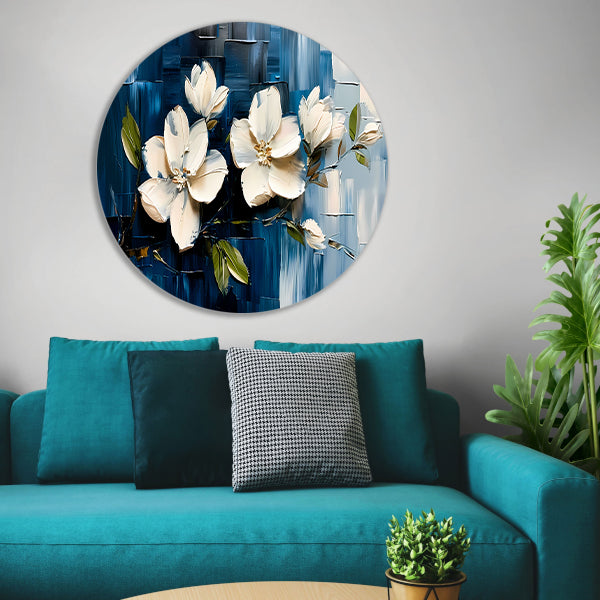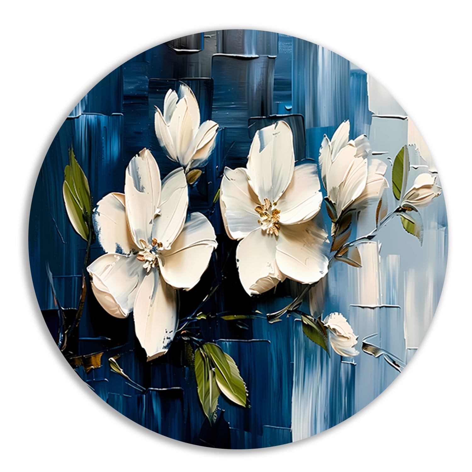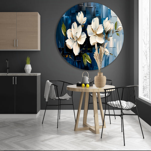 Abstracte witte bloemen op blauwe achtergrond aluminium muurcirkel
