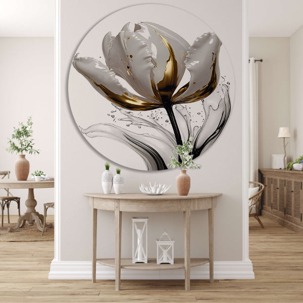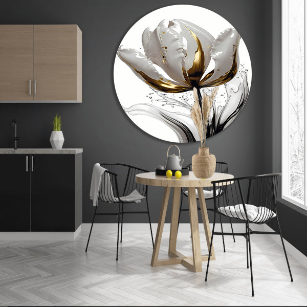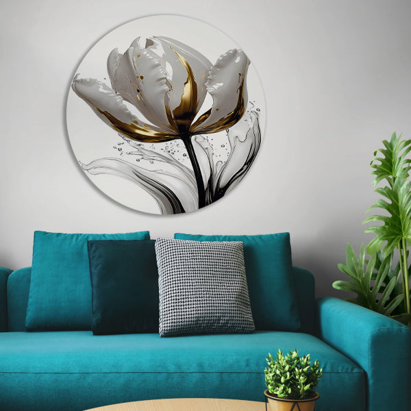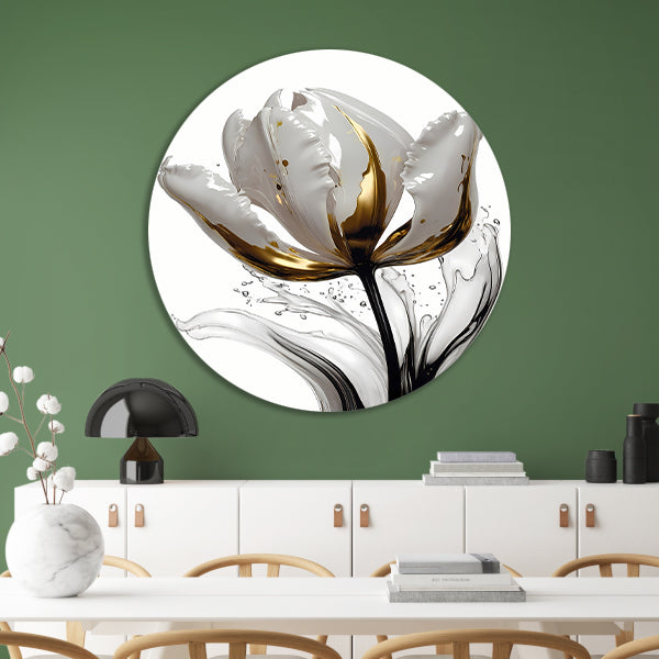 Abstracte witte en gouden tulp met druppels aluminium muurcirkel
