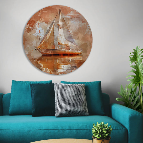 Abstracte zeilboot op reflecterend water aluminium muurcirkel