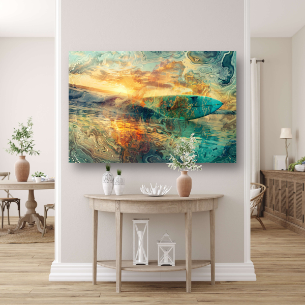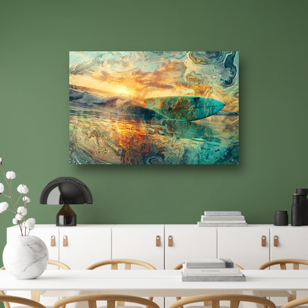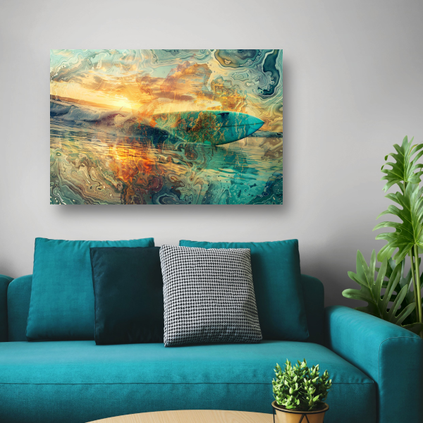 De afbeelding van een idyllische zonsondergang aan zee met een surfplank op de voorgrond geeft een rustgevend en sereen gevoel aan elke ruimte. Of je nu een liefhebber bent van surfen of gewoon geniet van mooie zonsondergangen, dit kunstwerk zal zeker de aandacht trekken.