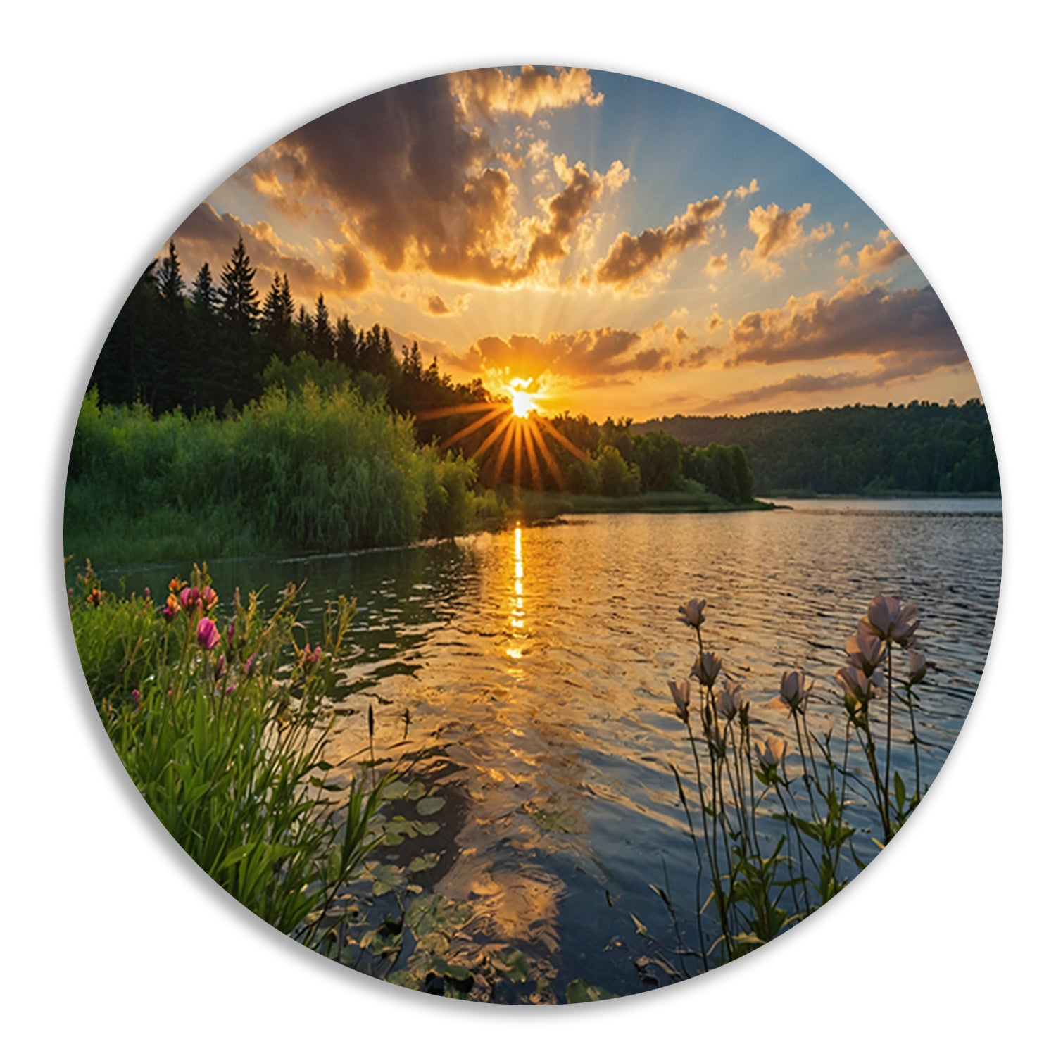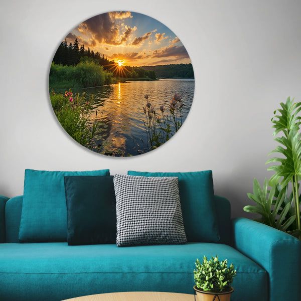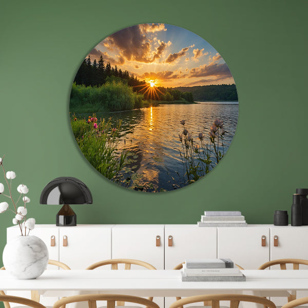 Adembenemende zonsondergang bij rustig meer aluminium muurcirkel