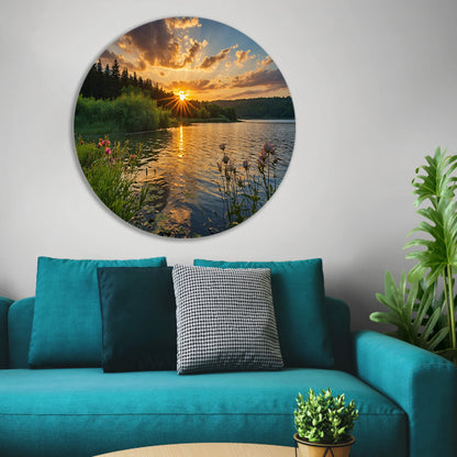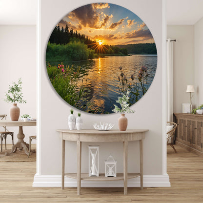 Geniet elke dag van de prachtige kleuren van de ondergaande zon en de reflectie in het rustige meer met deze adembenemende muurcirkel. Voeg een vleugje natuurlijke schoonheid toe aan jouw interieur en creëer een ontspannen sfeer met deze unieke wanddecoratie.