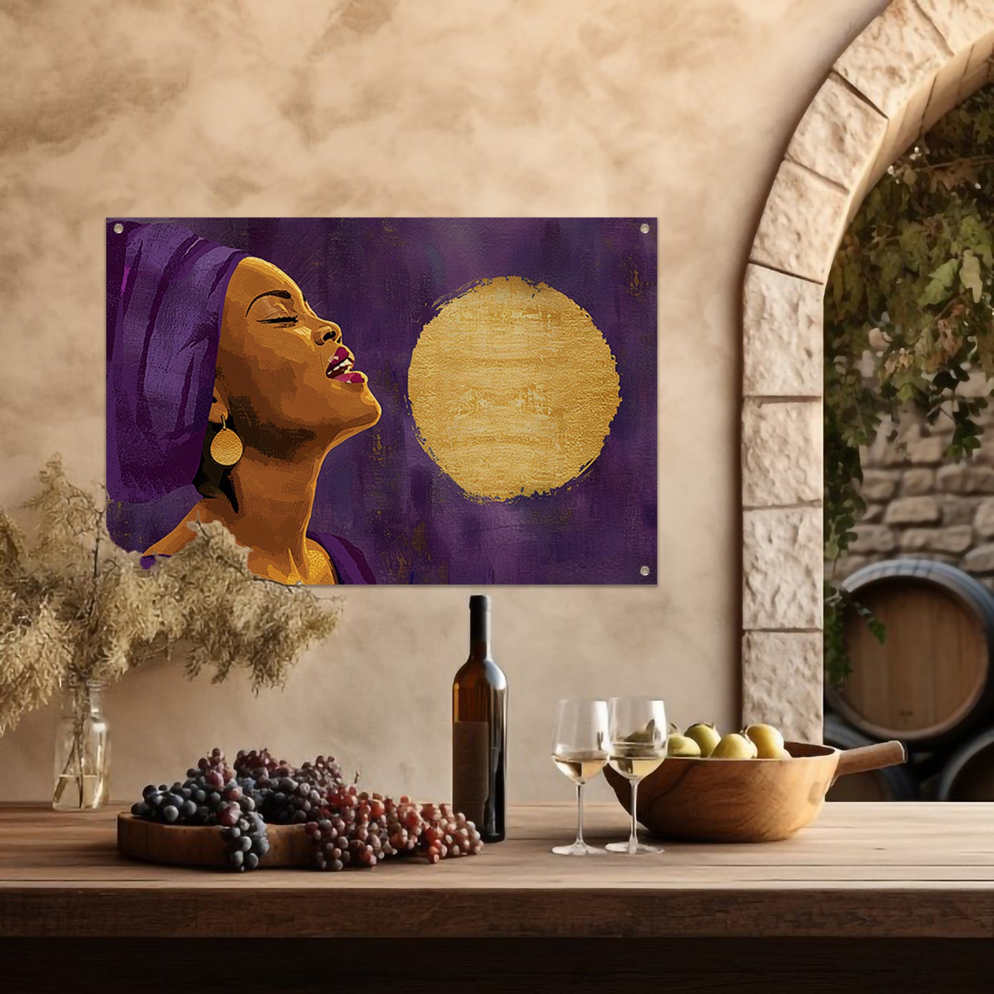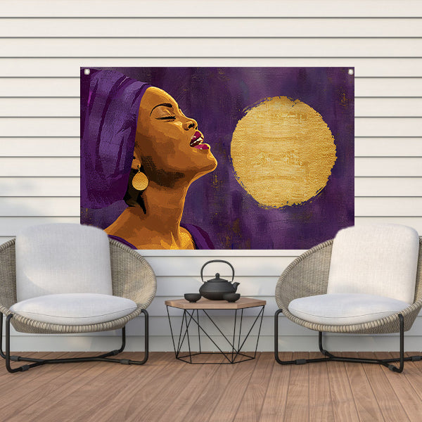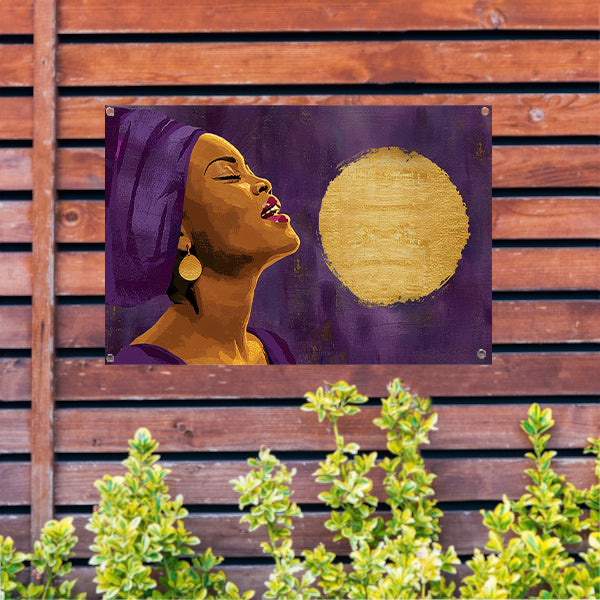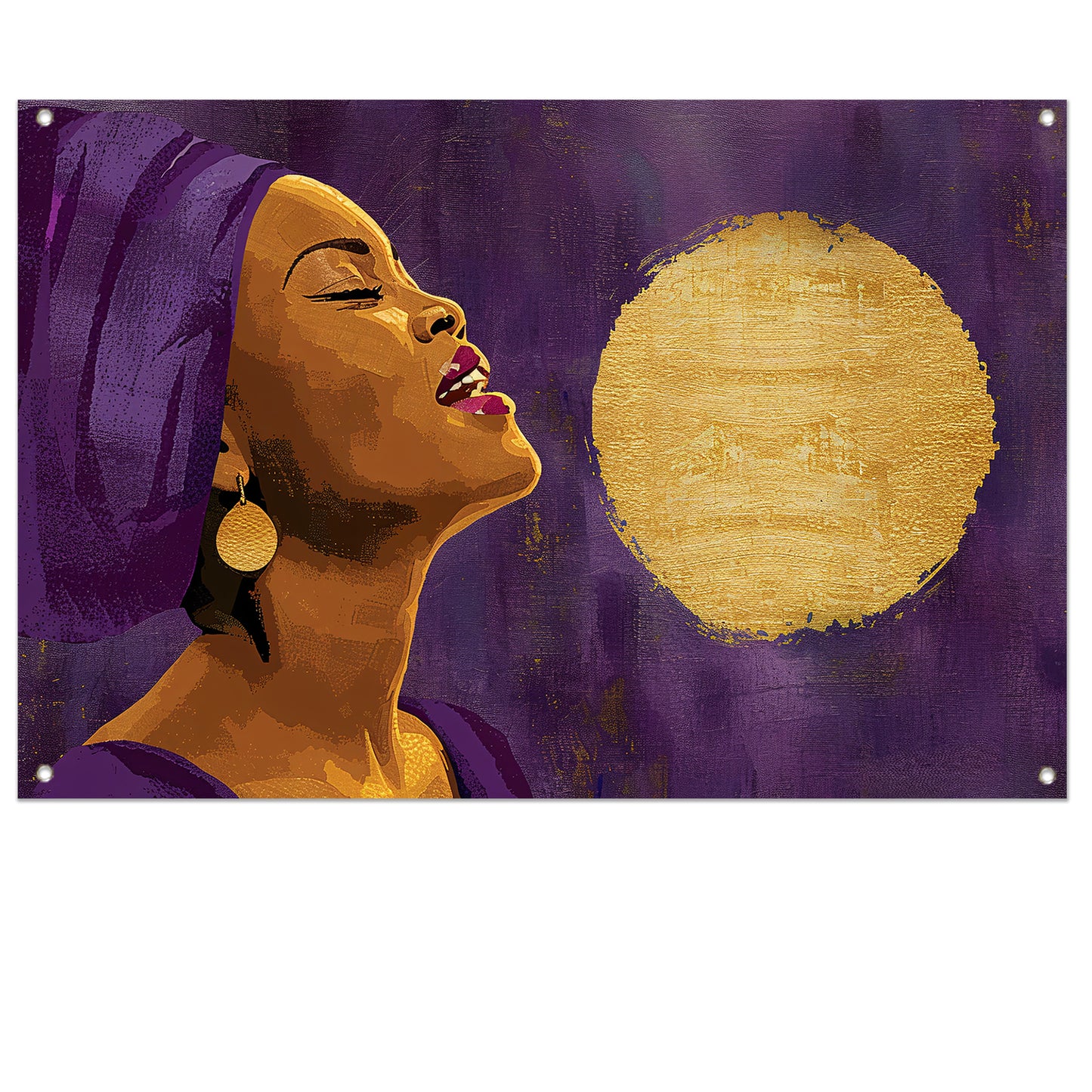 Afrikaanse vrouw met paarse doek en gouden maan tuinposter