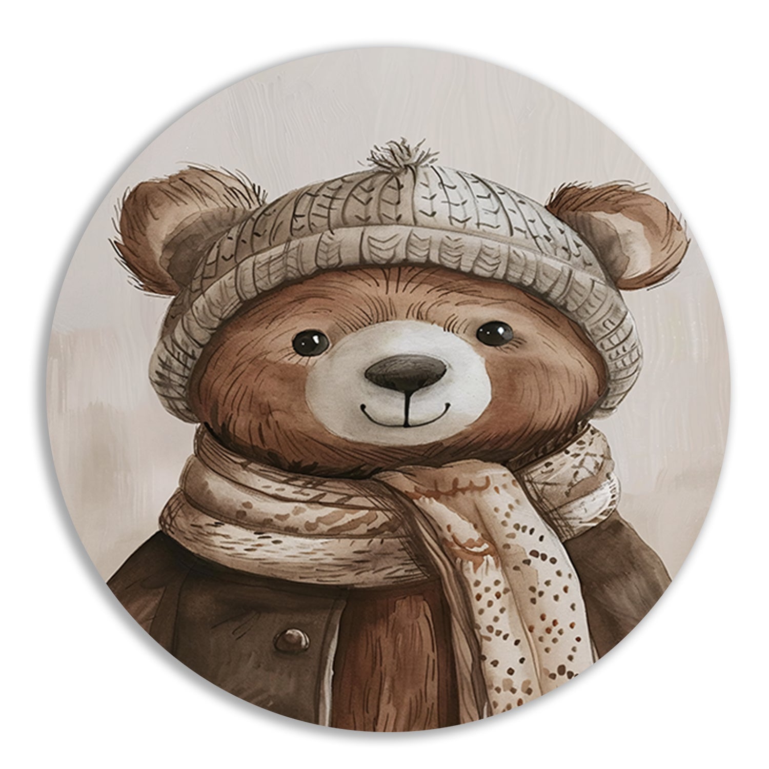 De aquarel van de beer met sjaal geeft een warme en gezellige sfeer aan elke kamer. Of je hem nu in de woonkamer, slaapkamer of kinderkamer hangt, deze muurcirkel zal zeker de aandacht trekken en een unieke touch geven aan je interieur.