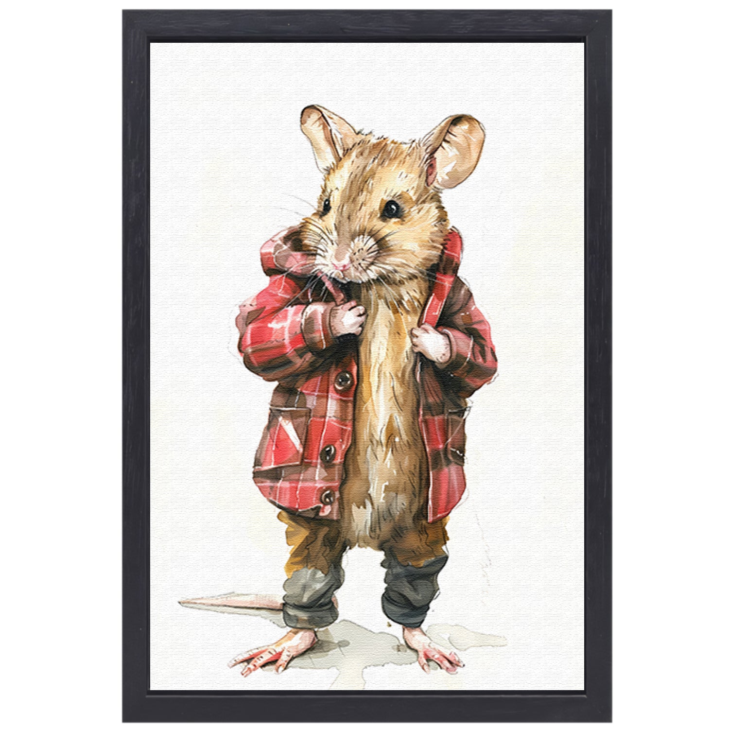 Aquarel van muis in geruite jas canvas met baklijst