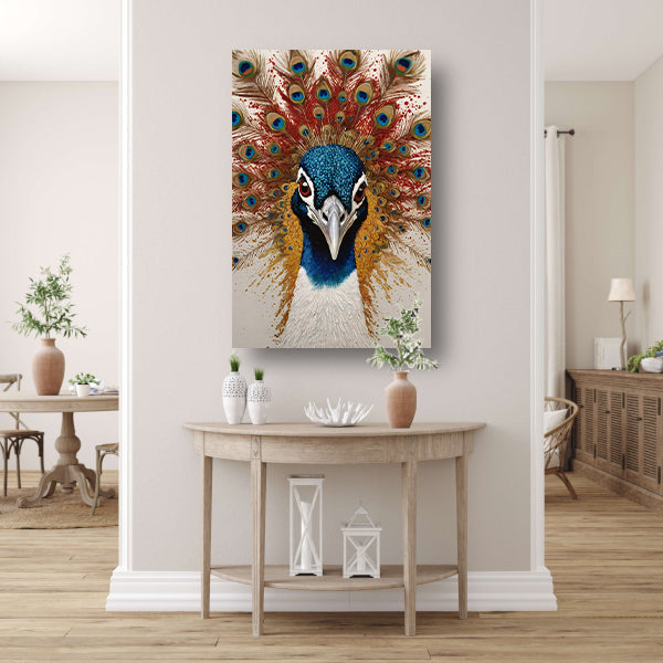Dit kunstwerk is verkrijgbaar in diverse formaten, waardoor het perfect past in elke ruimte in huis. De levendige kleuren en gedetailleerde patronen van de pauw zorgen voor een opvallend en stijlvol accent in elke kamer.