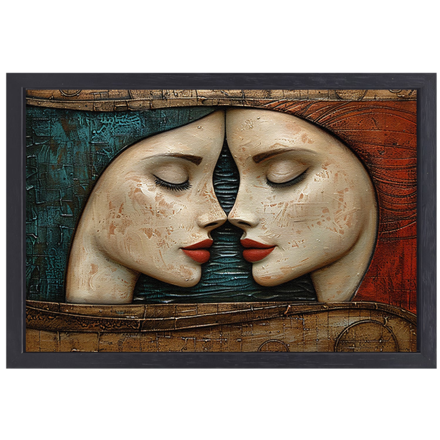 Artistieke omhelzing van twee gezichten canvas met baklijst