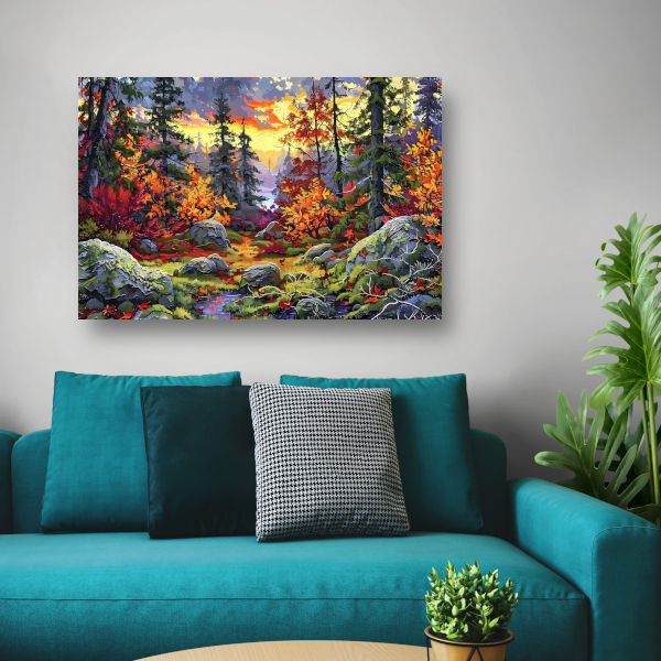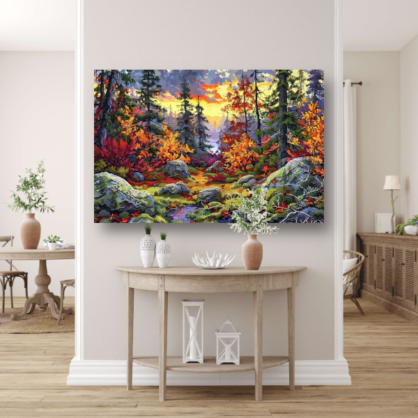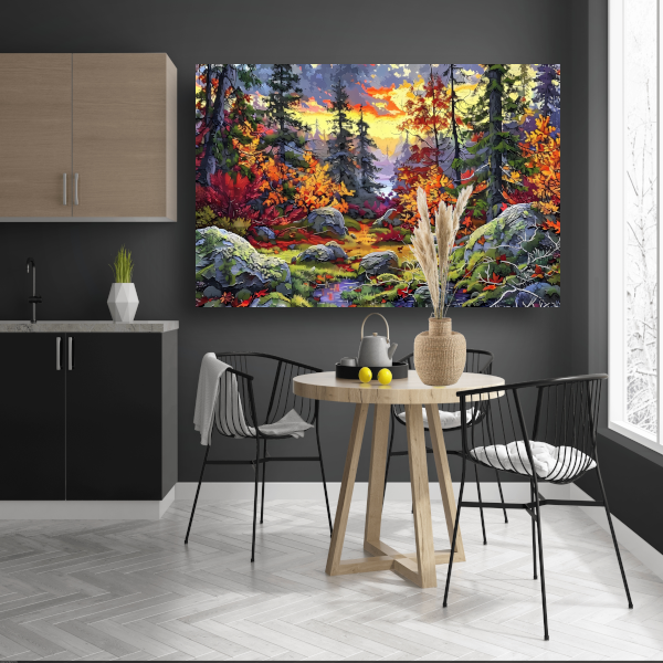 Haal dit unieke kunstwerk in huis en laat je inspireren door de magische sfeer van de avondschemering in het bos.