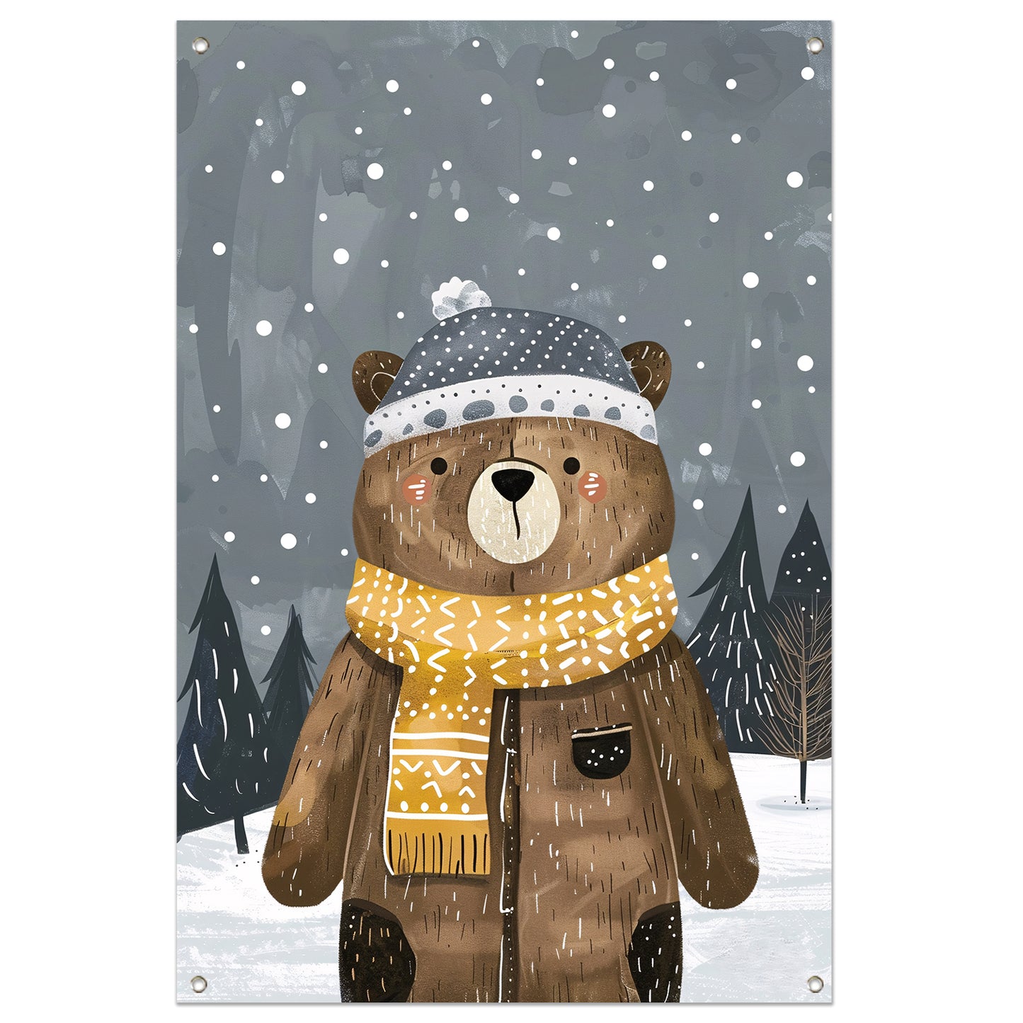 Beer met warme jas in sneeuwlandschap tuinposter