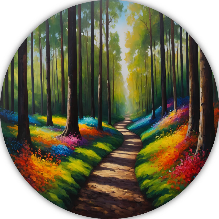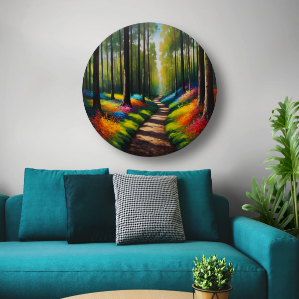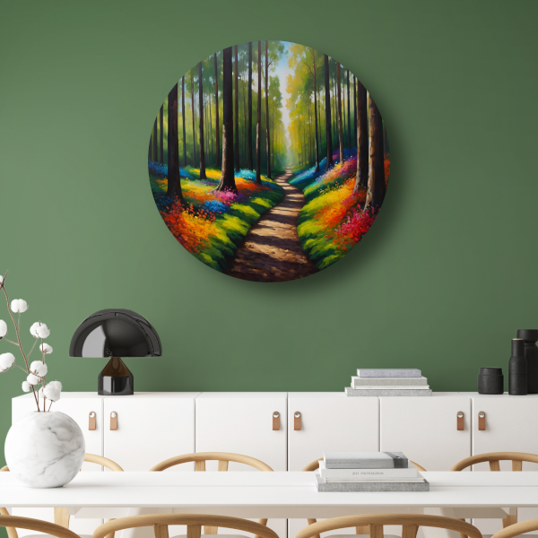 Betoverend Kleurrijk Bos met Wandelend Pad aluminium muurcirkel