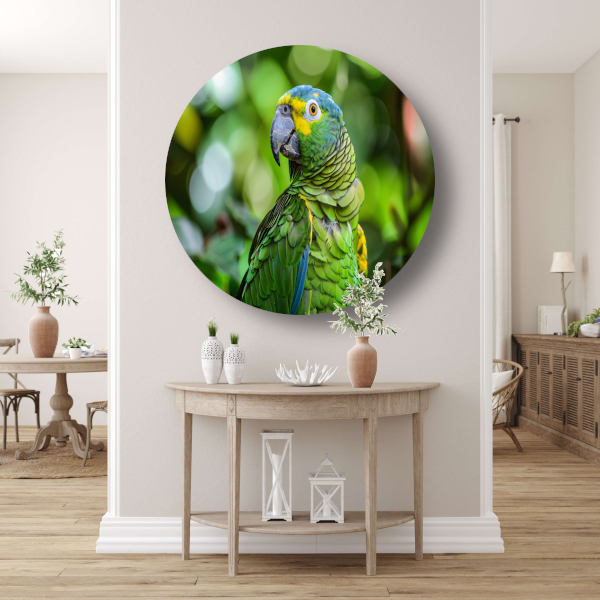 De levendige afbeelding van een kleurrijke papegaai zal zeker een eyecatcher zijn in elke ruimte. Of je nu een liefhebber bent van exotische dieren of gewoon op zoek bent naar een uniek kunstwerk voor aan de muur, deze muurcirkel zal zeker aan je wensen voldoen.