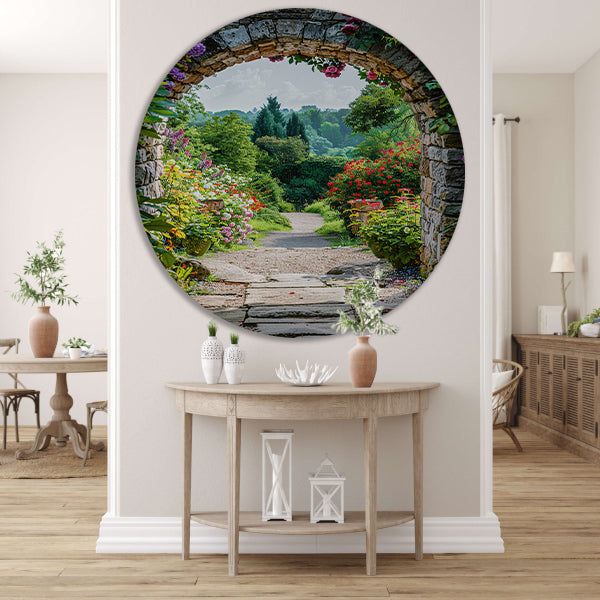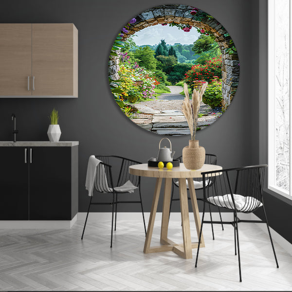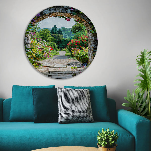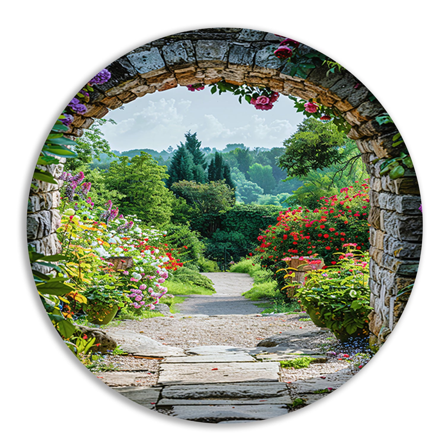 Betoverende boogpoort met kleurrijke bloemen aluminium muurcirkel