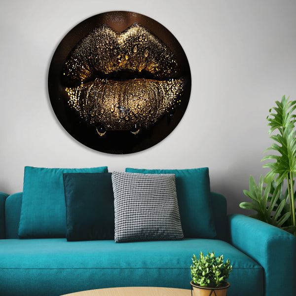 Betoverende gouden glitter lippen met waterdruppels aluminium muurcirkel