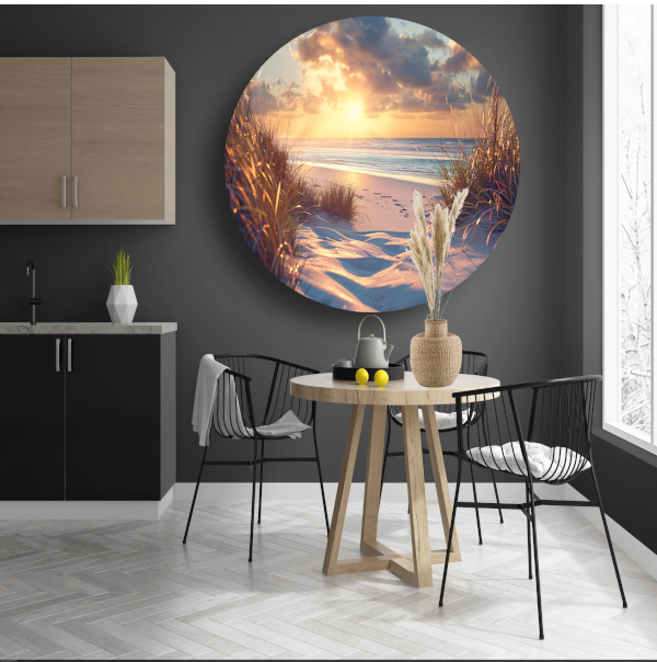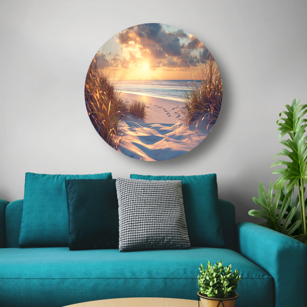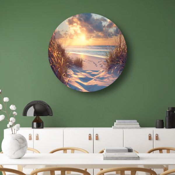 Betoverende zonsondergang op het strand met levendige kleuren forex muurcirkel