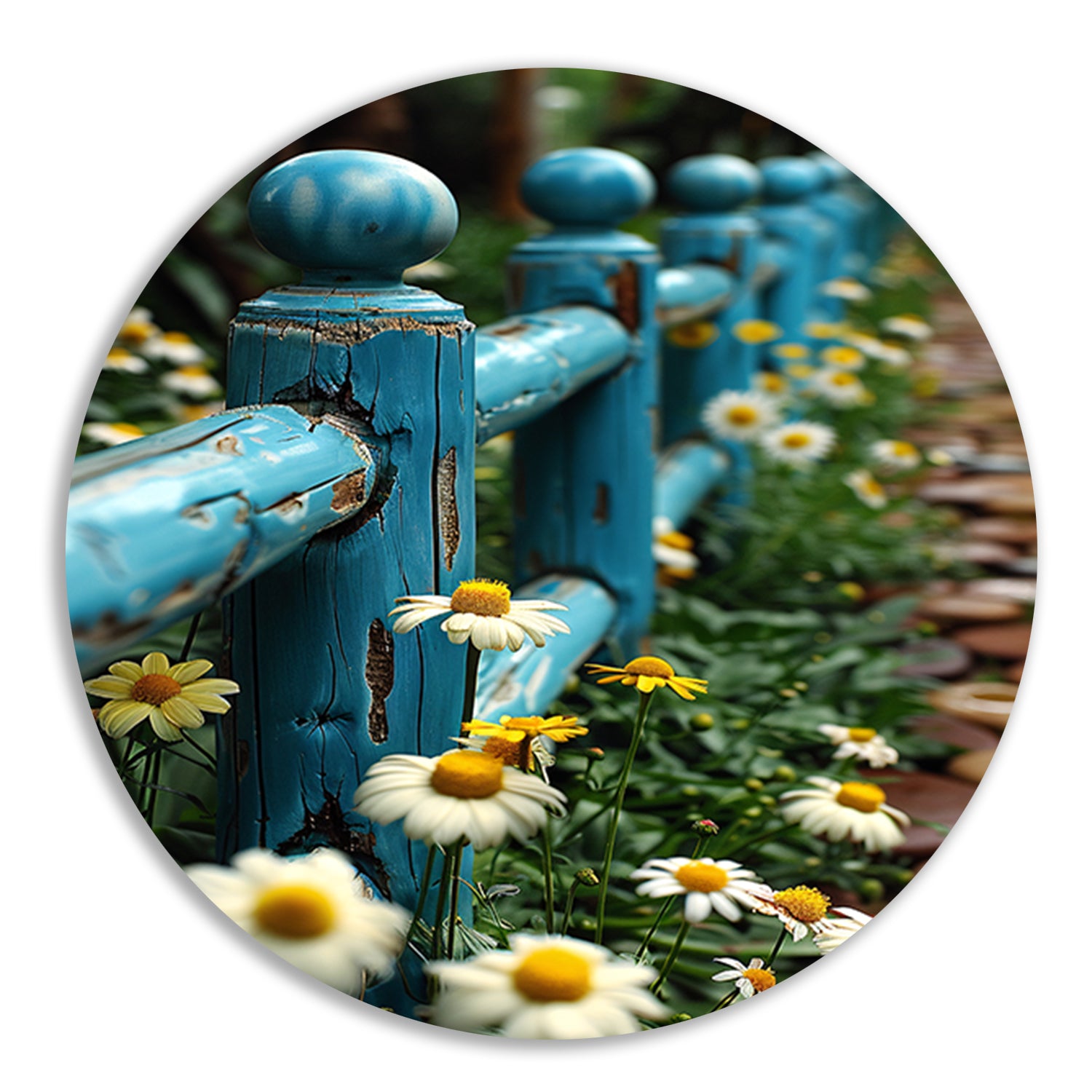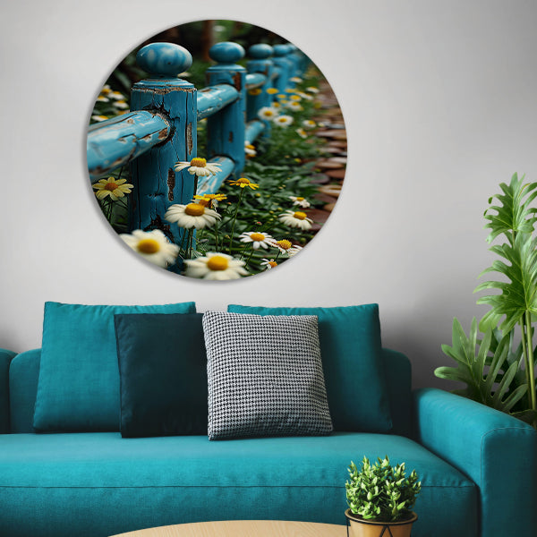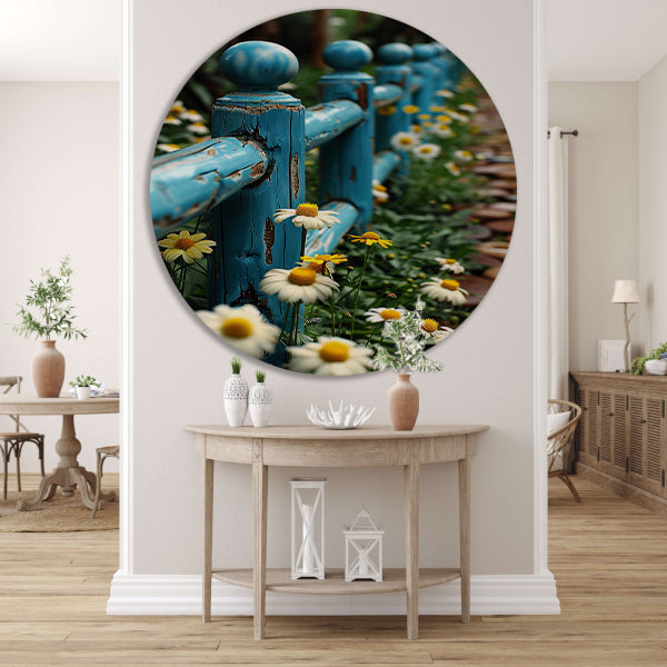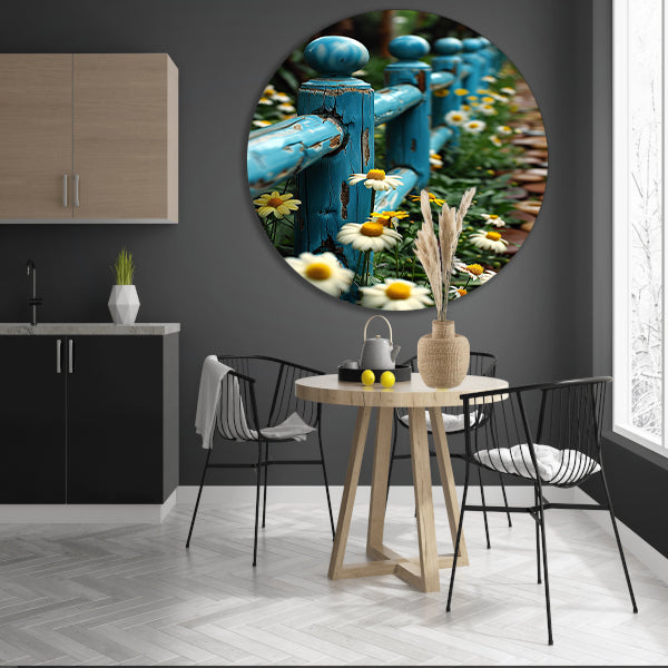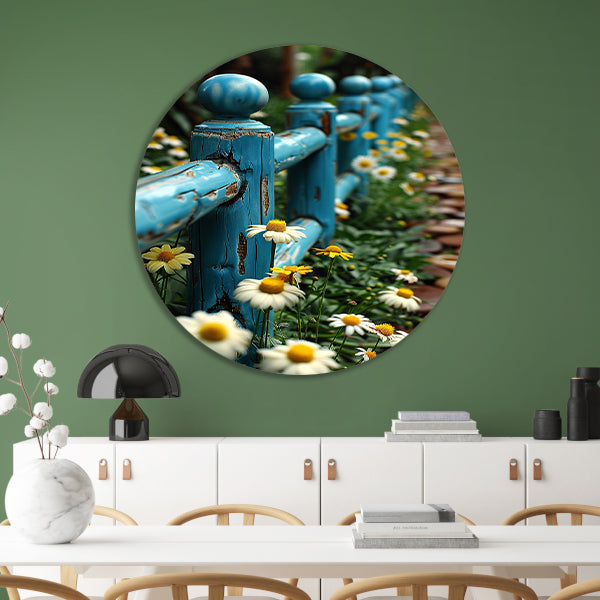 De blauwe tinten van het verweerde hek en de felgele margrieten zorgen voor een frisse en levendige uitstraling die perfect past bij een landelijk of bloemrijk interieur. Breng de schoonheid van de natuur in huis met deze prachtige muurcirkel en geniet elke dag van het vredige tafereel in de tuin.