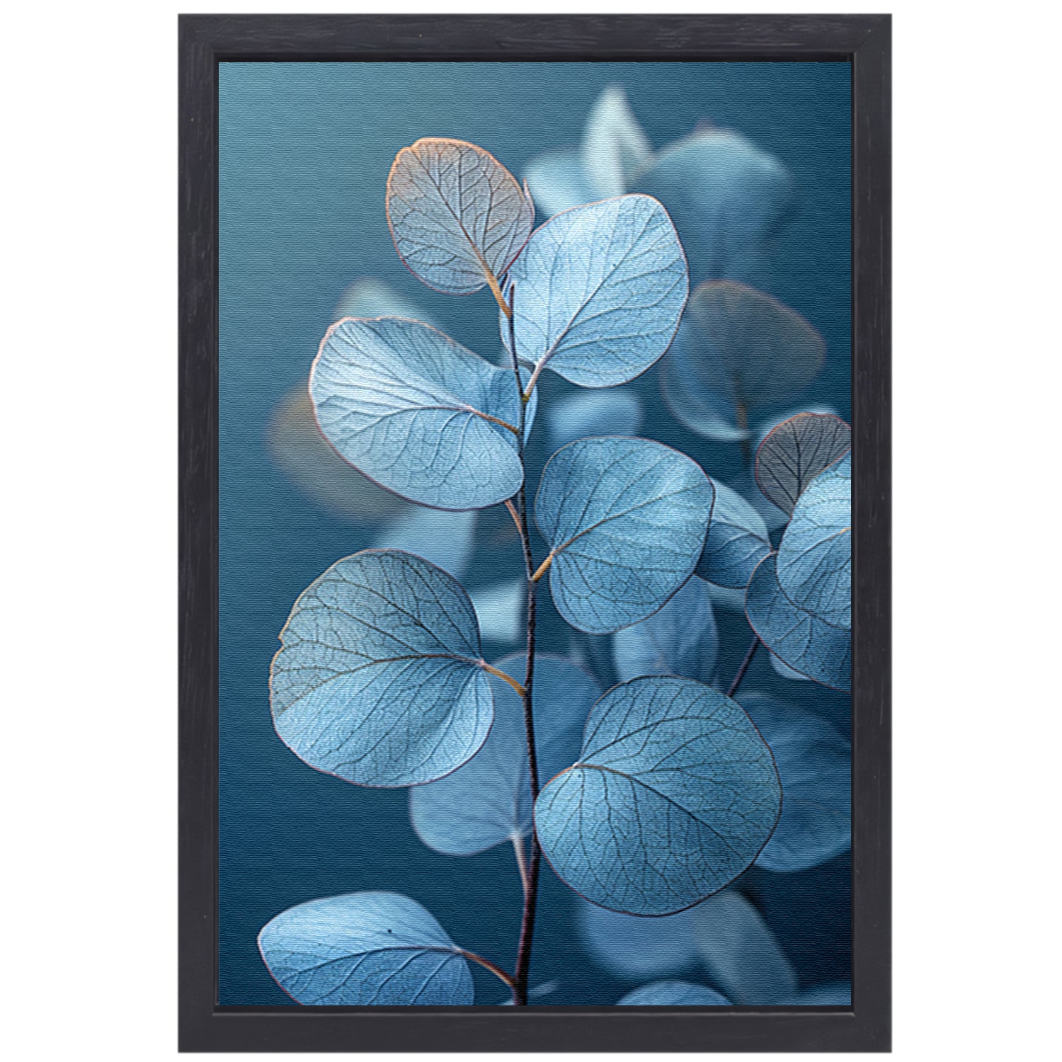 Blauwe eucalyptusbladeren in minimalistisch realisme canvas met baklijst
